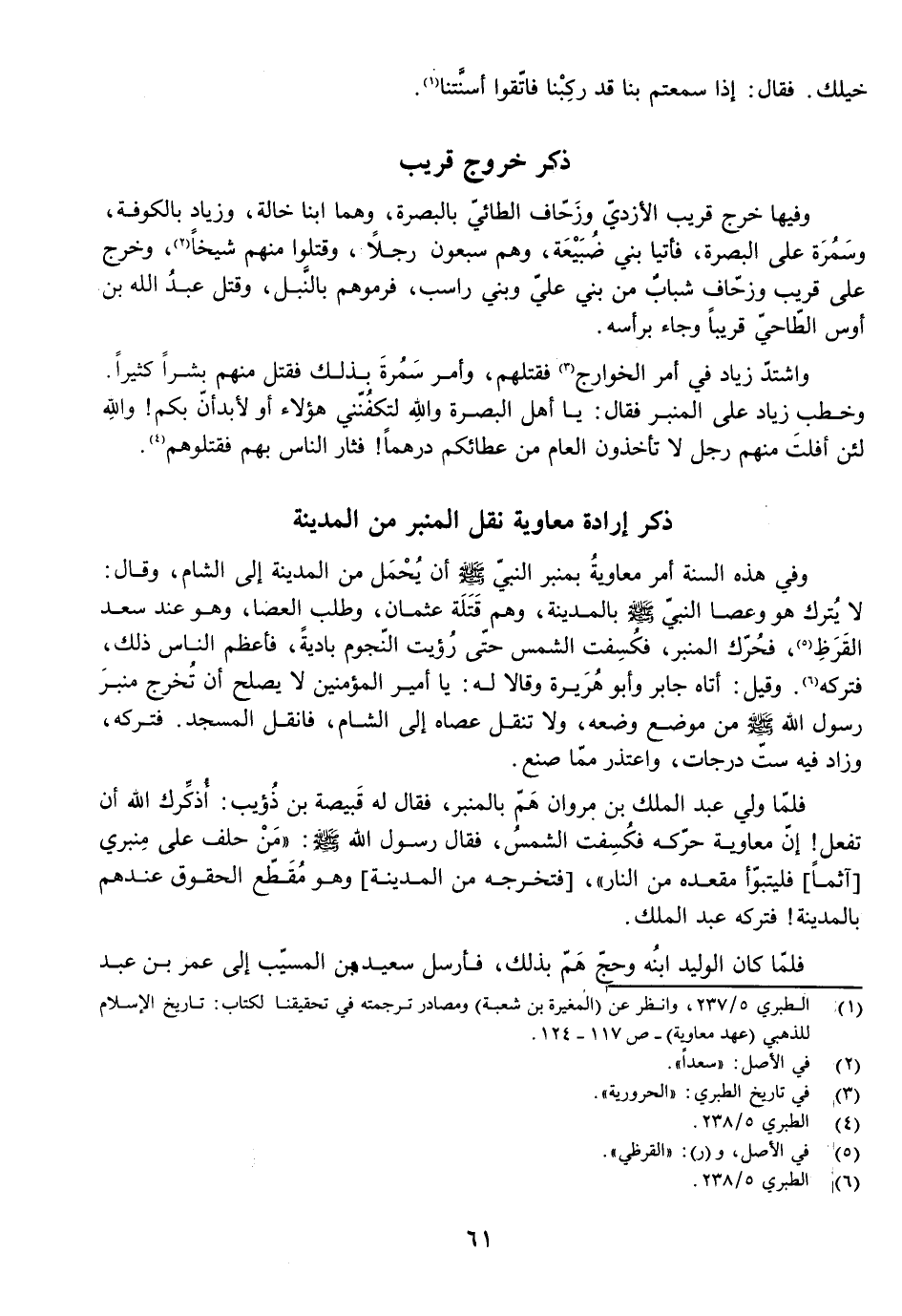 وَفِي هَذِهِ السَّنَةِ أَمَرَ مُعَاوِيَةُ بِمِنْبَرِ النَّبِيِّ - صَلَّى اللَّهُ عَلَيْهِ وَسَلَّمَ - أَنْ يُحْمَلَ مِنَ الْمَدِينَةِ إِلَى الشَّامِ، وَقَالَ: لَا يُتْرَكُ هُوَ وَعَصَا النَّبِيِّ - صَلَّى اللَّهُ عَلَيْهِ وَسَلَّمَ -، بِالْمَدِينَةِ وَهُمْ قَتَلَةُ عُثْمَانَ، وَطَلَبَ الْعَصَا، وَهُوَ عِنْدُ سَعْدٍ الْقَرَظِ، فَحُرِّكَ الْمِنْبَرُ فَكُسِفَتِ الشَّمْسُ حَتَّى رُؤَيَتِ النُّجُومُ بَادِيَةً، فَأَعْظَمَ النَّاسُ ذَلِكَ، فَتَرَكَهُ. وَقِيلَ أَتَاهُ جَابِرٌ وَأَبُو هُرَيْرَةَ وَقَالَا لَهُ: يَا أَمِيرَ الْمُؤْمِنِينَ لَا يَصْلُحُ أَنْ تُخْرِجَ مِنْبَرَ رَسُولِ اللَّهِ - صَلَّى اللَّهُ عَلَيْهِ وَسَلَّمَ - مِنْ مَوْضِعٍ وَضَعَهُ، وَلَا تَنْقُلْ عَصَاهُ إِلَى الشَّامِ، فَانْقُلِ الْمَسْجِدَ، فَتَرَكَهُ، وَزَادَ فِيهِ سِتَّ دَرَجَاتٍ وَاعْتَذَرَ مِمَّا صَنَعَ.