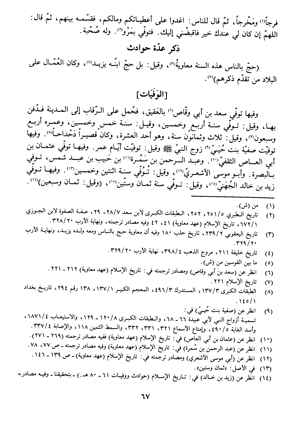 وَفِيهَا تُوُفِّيَ سَعْدُ بْنُ أَبِي وَقَّاصٍ بِالْعَقِيقِ فَحُمِلَ عَلَى الرِّقَابِ إِلَى الْمَدِينَةِ فَدُفِنَ بِهَا، وَقِيلَ: تُوُفِّيَ سَنَةَ أَرْبَعٍ وَخَمْسِينَ، وَقِيلَ: سَنَةَ خَمْسٍ وَخَمْسِينَ، وَعُمُرُهُ أَرْبَعٌ وَسَبْعُونَ، وَقِيلَ: ثَلَاثٌ وَثَمَانُونَ سَنَةً، وَهُوَ أَحَدُ الْعَشَرَةِ، وَكَانَ قَصِيرًا دَحْدَاحًا. وَفِيهَا تُوُفِّيَتْ صَفِيَّةُ بِنْتُ حُيَيٍّ زَوْجُ النَّبِيِّ - صَلَّى اللَّهُ عَلَيْهِ وَسَلَّمَ - وَقِيلَ: تُوُفِّيَتْ أَيَّامَ عُمَرَ. وَفِيهَا تُوُفِّيَ عُثْمَانُ بْنُ أَبِي الْعَاصِ الثَّقَفِيُّ.