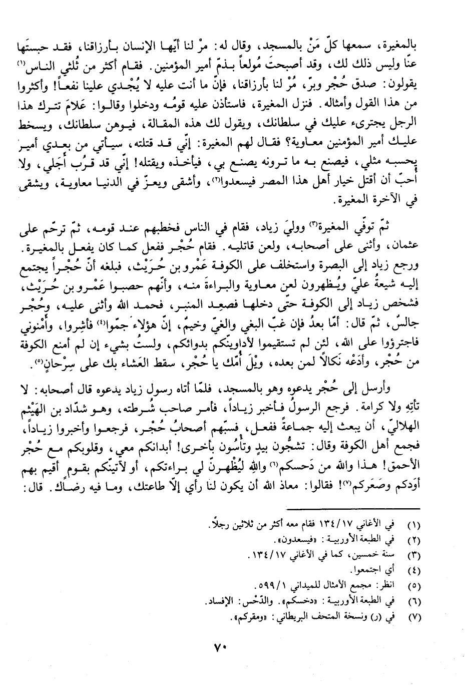 ثُمَّ تُوُفِّيَ الْمُغِيرَةُ وَوَلِيَ زِيَادٌ، فَقَامَ فِي النَّاسِ فَخَطَبَهُمْ عِنْدَ قُدُومِهِ ثُمَّ تَرَحَّمَ عَلَى عُثْمَانَ وَأَثْنَى عَلَى أَصْحَابِهِ وَلَعَنَ قَاتِلِيهِ. فَقَامَ حُجْرٌ فَفَعَلَ كَمَا كَانَ يَفْعَلُ بِالْمُغِيرَةِ. وَرَجَعَ زِيَادٌ إِلَى الْبَصْرَةِ وَاسْتَخْلَفَ عَلَى الْكُوفَةِ عَمْرَو بْنَ حُرَيْثٍ، فَبَلَغَهُ أَنَّ حُجْرًا يَجْتَمِعُ إِلَيْهِ شِيعَةُ عَلِيٍّ وَيُظْهِرُونَ لَعْنَ مُعَاوِيَةَ وَالْبَرَاءَةَ مِنْهُ وَأَنَّهُمْ حَصَبُوا عَمْرَو بْنَ حُرَيْثٍ، فَشَخَصَ زِيَادٌ إِلَى الْكُوفَةِ حَتَّى دَخَلَهَا فَصَعِدَ الْمِنْبَرَ فَحَمِدَ اللَّهَ وَأَثْنَى عَلَيْهِ، وَحُجْرٌ جَالِسٌ، ثُمَّ قَالَ: أَمَّا بَعْدُ فَإِنَّ غَبَّ الْبَغْيِ وَالْغَيِّ وَخِيَمٌ، إِنَّ هَؤُلَاءِ جَمُّوا فَأَشِرُوا، وَأَمِنُونِي فَاجْتَرَءُوا عَلَى اللَّهِ، لَئِنْ لَمْ تَسْتَقِيمُوا لَأُدَاوِيَنَّكُمْ بِدَوَائِكُمْ، وَلَسْتُ بِشَيْءٍ إِنْ لَمْ أَمْنَعِ الْكُوفَةَ مِنْ حُجْرٍ، وَأَدَعْهُ نَكَالًا لِمَنْ بَعْدَهُ، وَيْلُ أُمِّكَ يَا حُجْرُ، سَقَطَ الْعَشَاءُ بِكَ عَلَى سِرْحَانٍ.