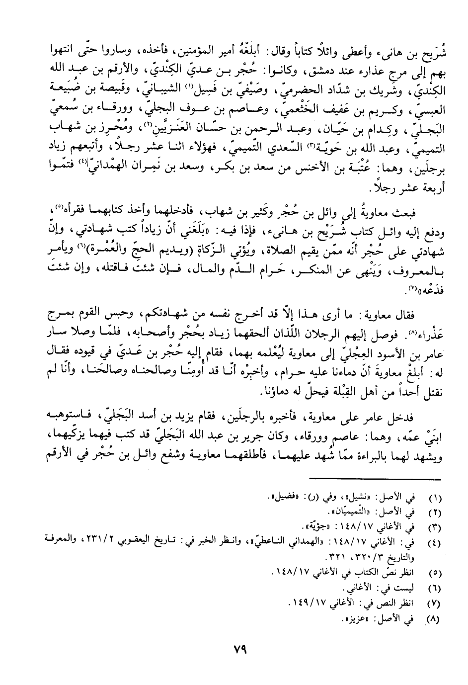 شُرَيْحُ بْنُ هَانِئٍ وَأَعْطَى وَائِلًا كِتَابًا وَقَالَ: أَبْلِغْهُ أَمِيرَ الْمُؤْمِنِينَ، فَأَخَذَهُ، وَسَارُوا حَتَّى انْتَهَوْا بِهِمْ إِلَى مَرْجِ عَذْرَاءَ عِنْدَ دِمَشْقَ، وَكَانُوا: حُجْرَ بْنَ عَدِيٍّ الْكِنْدِيَّ، وَالْأَرْقَمَ بْنَ عَبْدِ اللَّهِ الْكِنْدِيَّ، وَشَرِيكَ بْنَ شَدَّادٍ الْحَضْرَمِيَّ، وَصَيْفِيَّ بْنَ فَسِيلٍ الشَّيْبَانِيَّ، وَقَبِيصَةَ بْنَ ضُبَيْعَةَ الْعَبْسِيَّ، وَكَرِيمَ بْنَ عَفِيفٍ الْخَثْعَمِيَّ، وَعَاصِمَ بْنَ عَوْفٍ الْبَجَلِيَّ، وَوَرْقَاءَ بْنَ سُمَعِيٍّ الْبَجَلِيَّ، وَكِدَامَ بْنَ حَيَّانَ، وَعَبْدَ الرَّحْمَنِ بْنَ حَسَّانَ الْعَنَزِيَّيْنِ، وَمُحْرِزَ بْنَ شِهَابٍ التَّمِيمِيَّ، وَعَبْدَ اللَّهِ بْنَ حَوِيَّةَ السَّعْدِيَّ التَّمِيمِيَّ، فَهَؤُلَاءِ اثْنَا عَشَرَ رَجُلًا، وَأَتْبَعَهُمْ زِيَادٌ بِرَجُلَيْنِ، هُمَا: عُتْبَةُ بْنُ الْأَخْنَسِ مِنْ سَعْدِ بْنِ بَكْرٍ، وَسَعْدُ بْنُ نَمِرَانَ الْهَمْدَانِيُّ، فَتَمُّوا أَرْبَعَةَ عَشَرَ رَجُلًا.