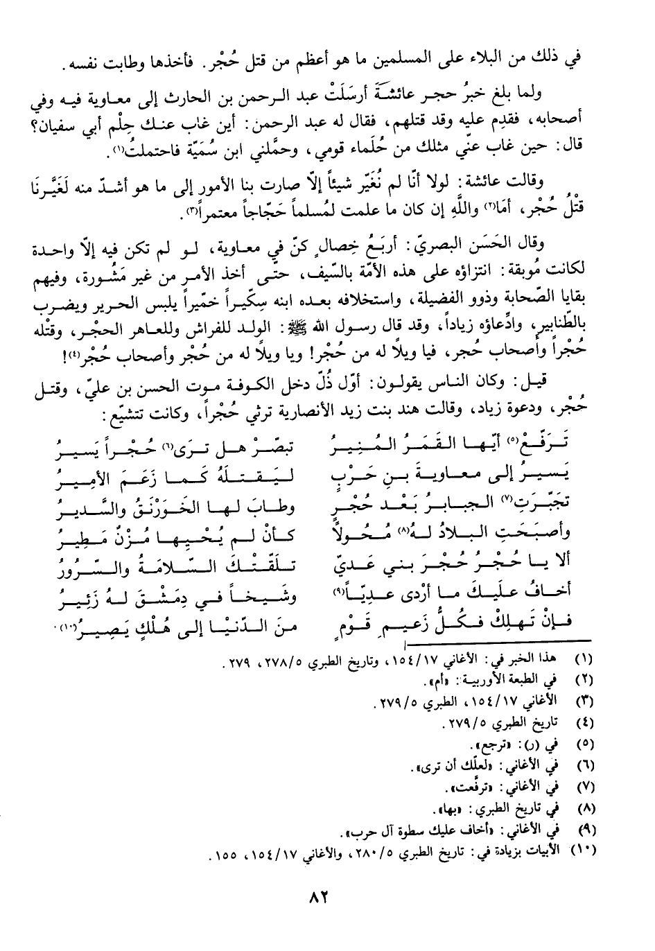 وَلَمَّا بَلَغَ خَبَرُ حُجْرٍ عَائِشَةَ أَرْسَلَتْ عَبْدَ الرَّحْمَنِ بْنَ الْحَارِثِ إِلَى مُعَاوِيَةَ فِيهِ وَفِي أَصْحَابِهِ، فَقَدِمَ عَلَيْهِ وَقَدْ قَتَلَهُمْ، فَقَالَ لَهُ عَبْدُ الرَّحْمَنِ: أَيْنَ غَابَ عَنْكَ حُلْمُ أَبِي سُفْيَانَ؟ قَالَ: حِينَ غَابَ عَنِّي مِثْلُكَ مِنْ حُلَمَاءِ قَوْمِي وَحَمَلَنِي ابْنُ سُمَيَّةَ فَاحْتَمَلْتُ.