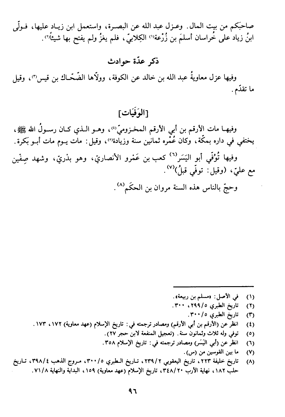 وَفِيهَا مَاتَ الْأَرْقَمُ بْنُ أَبِي الْأَرْقَمِ الْمَخْزُومِيُّ، وَهُوَ الَّذِي كَانَ رَسُولُ اللَّهِ - صَلَّى اللَّهُ عَلَيْهِ وَسَلَّمَ - يَخْتَفِي فِي دَارِهِ بِمَكَّةَ، وَكَانَ عُمُرُهُ ثَمَانِينَ سَنَةً وَزِيَادَةً، وَقِيلَ: مَاتَ يَوْمَ مَاتَ أَبُو بَكْرَةَ.