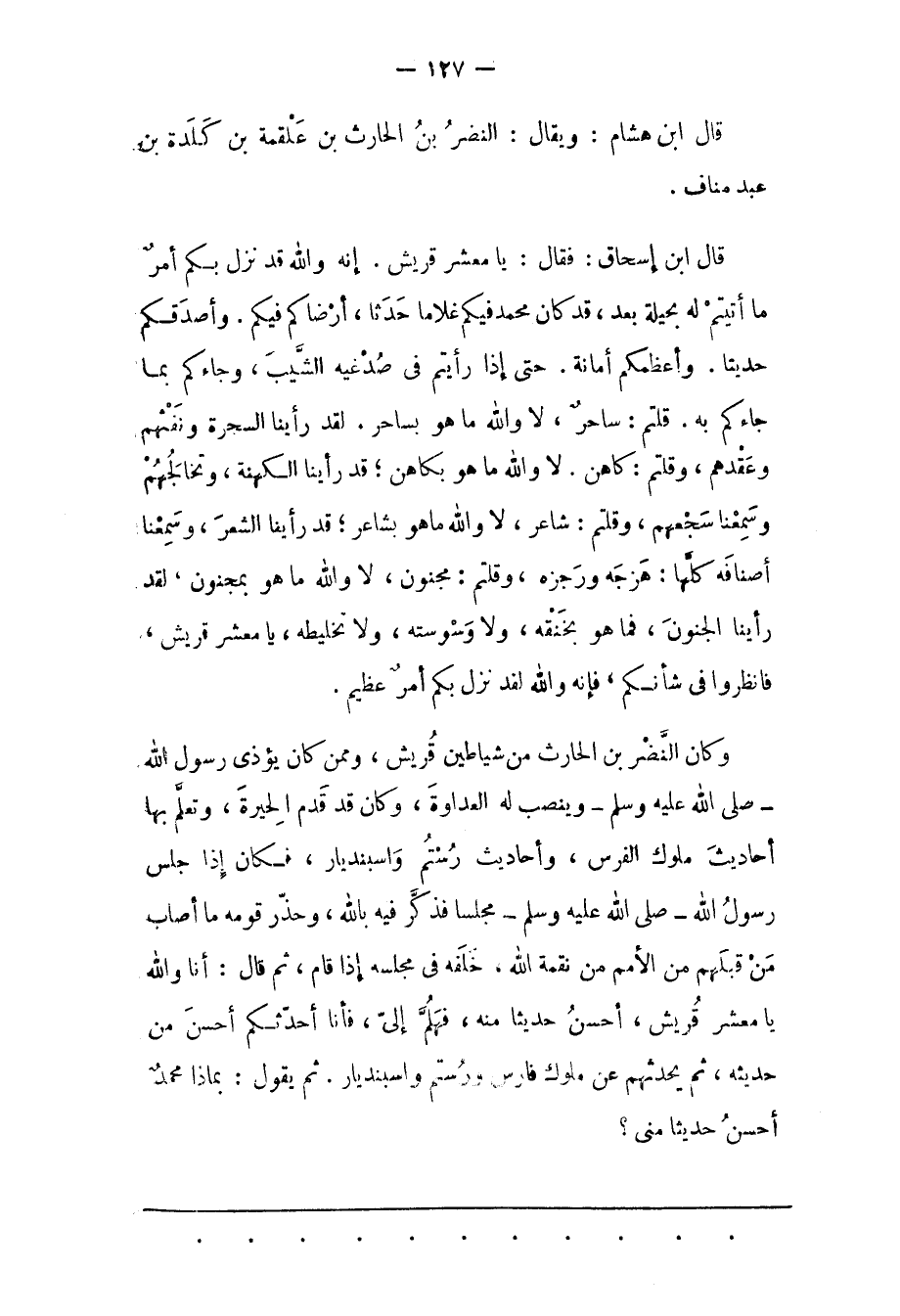وَكَانَ النّضْرُ بْنُ الْحَارِثِ مِنْ شَيَاطِينِ قُرَيْشٍ، وَمِمّنْ كَانَ يُؤْذِي رَسُولَ اللهِ- صَلَّى اللَّهُ عَلَيْهِ وَسَلَّمَ- وَيَنْصِبُ لَهُ الْعَدَاوَةَ، وَكَانَ قَدْ قَدِمَ الْحِيرَةَ، وَتَعَلّمَ بِهَا أَحَادِيثَ مُلُوكِ الْفُرْسِ، وَأَحَادِيثَ رُسْتُمَ واسبنديار، فَكَانَ إذَا جَلَسَ رَسُولُ الله- صَلّى اللهُ عَلَيْهِ وَسَلّمَ- مَجْلِسًا فَذَكّرَ فِيهِ بِاَللهِ، وَحَذّرَ قَوْمَهُ مَا أَصَابَ مَنْ قَبْلَهُمْ مِنْ الْأُمَمِ مِنْ نِقْمَةِ اللهِ، خَلَفَهُ فِي مَجْلِسِهِ إذَا قَامَ، ثُمّ قَالَ: أَنَا وَاَللهِ يَا مَعْشَرَ قُرَيْشٍ، أَحْسَنُ حَدِيثًا مِنْهُ، فَهَلُمّ إلَيّ، فَأَنَا أُحَدّثُكُمْ أَحْسَنَ مِنْ حَدِيثِهِ، ثُمّ يُحَدّثُهُمْ عَنْ مُلُوكِ فَارِسَ وَرُسْتُمَ واسبنديار. ثُمّ يَقُولُ: بِمَاذَا مُحَمّدٌ أَحْسَنُ حَدِيثًا مِنّي؟