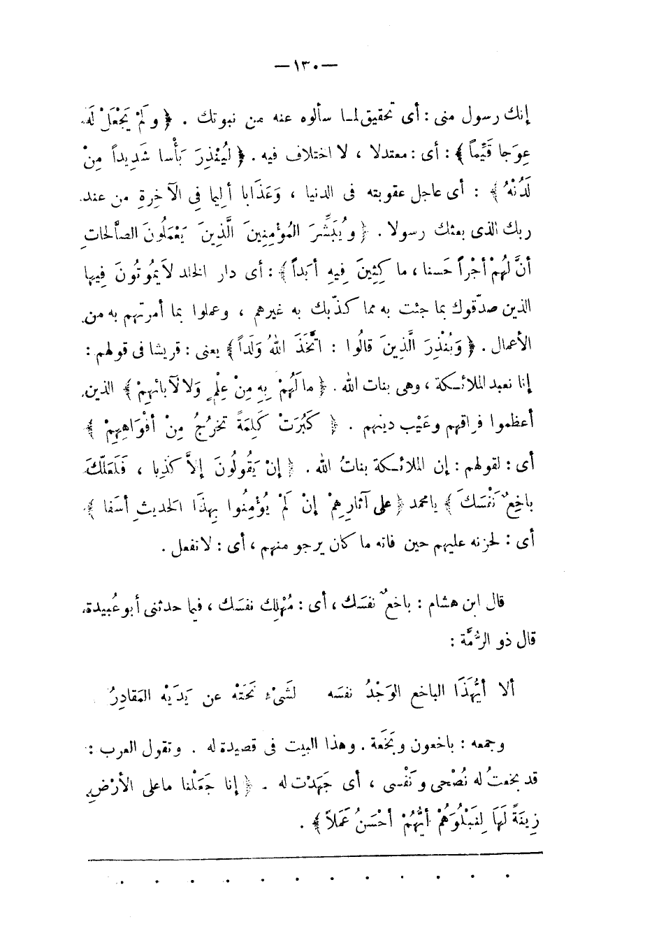 قَالَ ابْنُ هِشَامٍ: بَاخِعٌ نَفْسَك، أَيْ: مُهْلِكٌ نَفْسَك، فِيمَا حَدّثَنِي أَبُو عُبَيْدَةَ قَالَ ذُو الرّمّةِ: