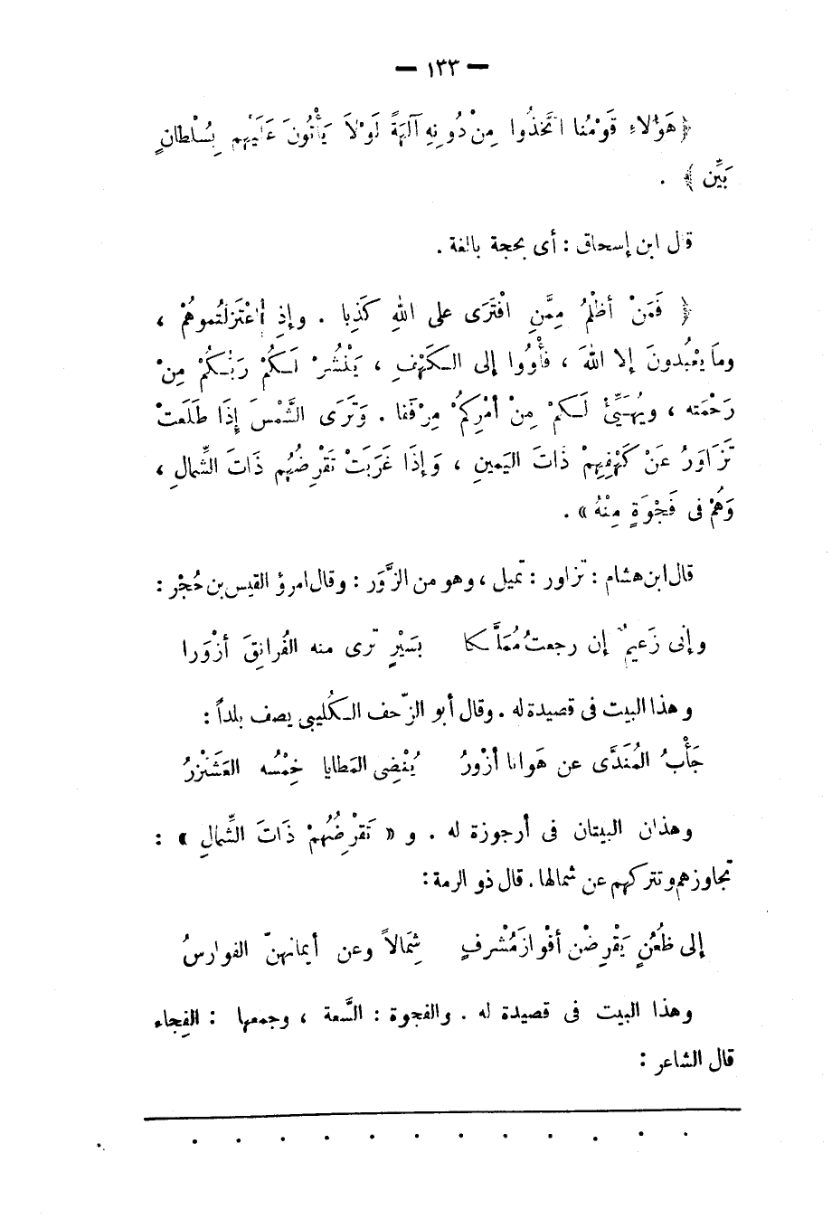 قَالَ ابْنُ هِشَامٍ: تَزَاوَرُ: تَمِيلُ، وَهُوَ مِنْ الزّورِ: وقال امرؤ القيس بن حجر: