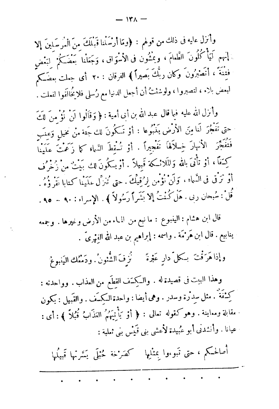 وَأَنْزَلَ اللهُ عَلَيْهِ فِيمَا قَالَ عَبْدُ اللهِ بْنُ أَبِي أُمَيّةَ: وَقالُوا لَنْ نُؤْمِنَ لَكَ حَتَّى تَفْجُرَ لَنا مِنَ الْأَرْضِ يَنْبُوعاً: أَوْ تَكُونَ لَكَ جَنَّةٌ مِنْ نَخِيلٍ وَعِنَبٍ فَتُفَجِّرَ الْأَنْهارَ خِلالَها تَفْجِيراً. أَوْ تُسْقِطَ السَّماءَ كَما زَعَمْتَ عَلَيْنا كِسَفاً، أَوْ تَأْتِيَ بِاللَّهِ وَالْمَلائِكَةِ قَبِيلًا. أَوْ يَكُونَ لَكَ بَيْتٌ مِنْ زُخْرُفٍ أَوْ تَرْقى فِي السَّماءِ، وَلَنْ نُؤْمِنَ لِرُقِيِّكَ. حَتَّى تُنَزِّلَ عَلَيْنا كِتاباً نَقْرَؤُهُ.