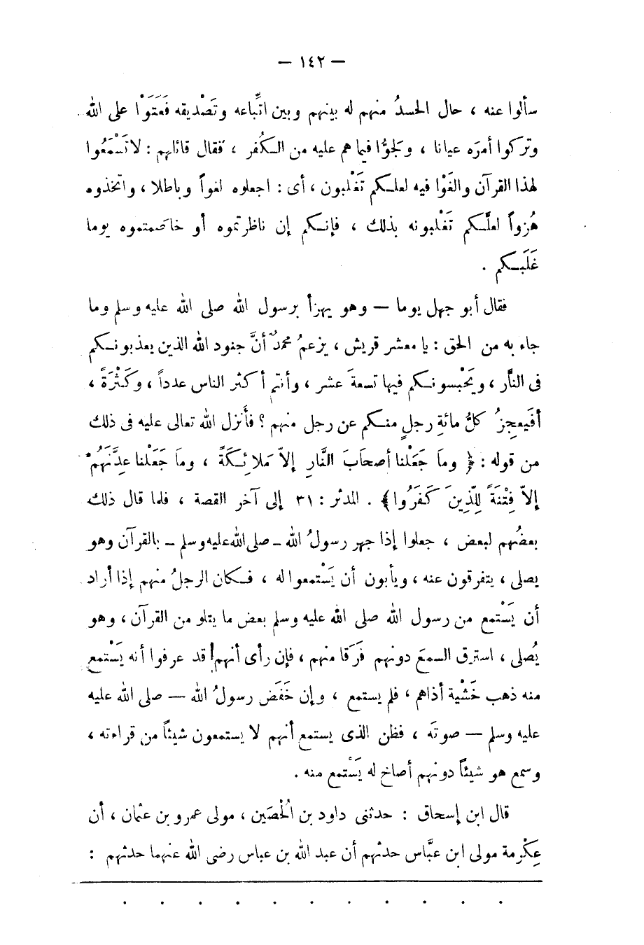 قَالَ ابْنُ إسْحَاقَ: حَدّثَنِي دَاوُدُ بْنُ الْحُصَيْنِ، مَوْلَى عَمْرِو بْنِ عُثْمَانَ، أَنّ عِكْرِمَةَ مَوْلَى ابْنِ عَبّاسٍ حَدّثَهُمْ أَنّ عَبْدَ اللهِ بْنَ عَبّاسٍ رَضِيَ اللهُ عَنْهُمَا حَدّثَهُمْ: