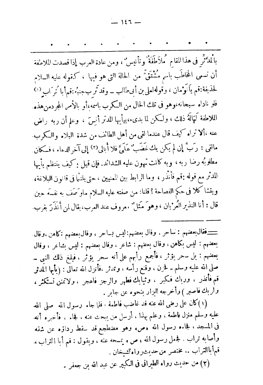 (1) كان على رضى الله عنه قد غاضب فاطمة، فلما جَاءَ رَسُولُ اللهِ صَلّى اللهُ عَلَيْهِ وَسَلّمَ منزل فاطمة، وعلم بهذا، أرسل من يبحث عنه، فجاء، فأخبره أنه فى المسجد، فجاءه رسول الله «ص» وهو مضطجع قد سقط رداؤه عن شقه وأصابه تراب. فجعل رسول الله «ص» يمسحه عنه، ويقول: قم أبا التراب، قم أبا التراب.. مختصر من حديث رواه الشيخان.