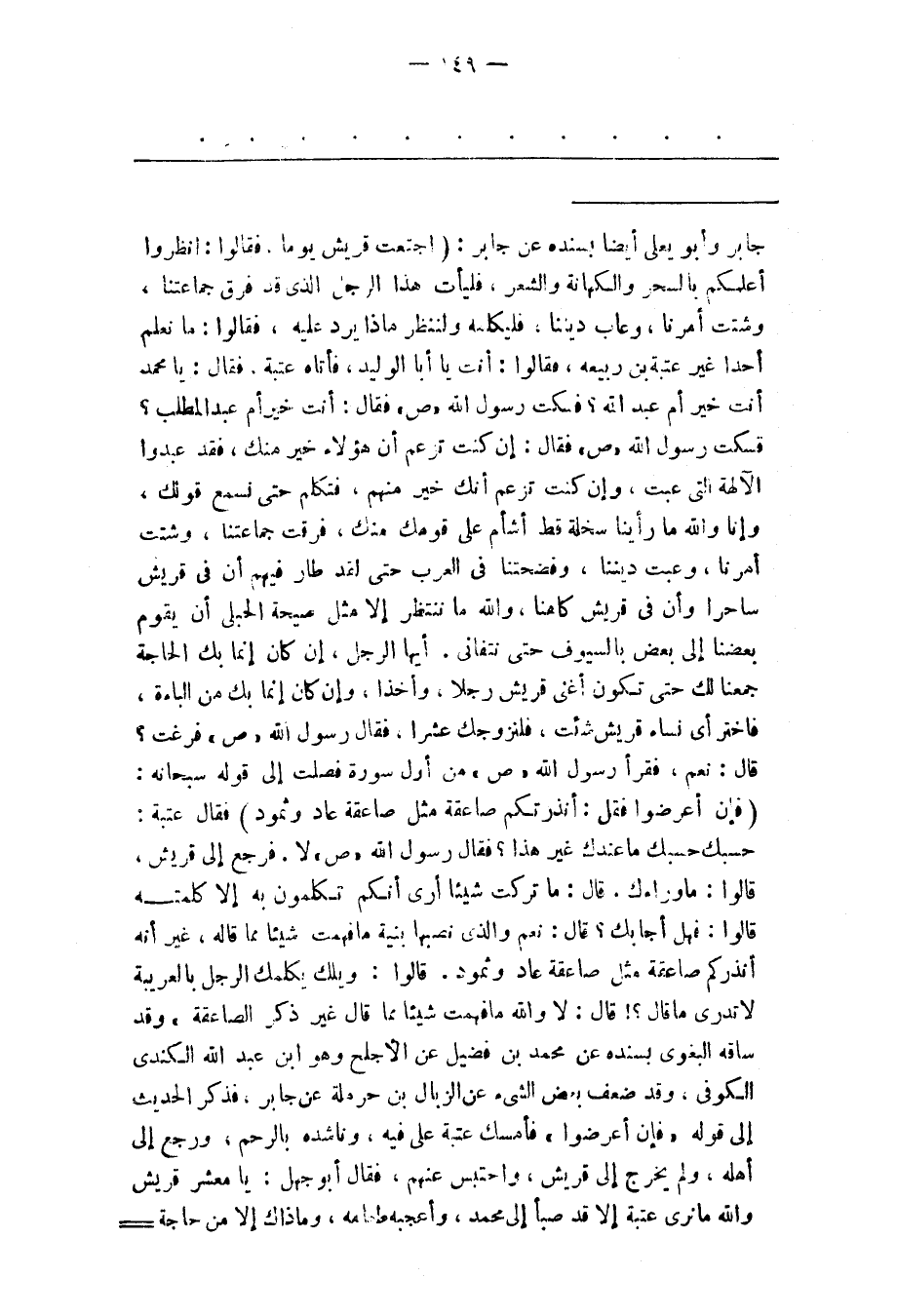 جابر وأبو يعلى أيضا بسنده عن جابر: (اجتمعت قريش يوما، فقالوا: انظروا أعلمكم بالسحر والكهانة والشعر، فليأت هذا الرجل الذى قد فرق جماعتنا، وشئت أمرنا، وعاب ديننا، فليكلمه ولننظر ماذا يرد عليه، فقالوا: ما نعلم أحدا غير عتبة بن ربيعه، فقالوا: أنت يا أبا الوليد، فأتاه عتبة، فقال: يا محمد أنت خير أم عبد الله؟ فسكت رسول الله «ص» فقال: أنت خير أم عبد المطلب؟ فسكت رسول الله «ص» فقال: إن كنت تزعم أن هؤلاء خير منك، فقد عبدوا الالهة التب عبت، وإن كنت تزعم أنك خير منهم، فتكلم حتى نسمع قولك، وإنا والله ما رأينا سخلة قط أشأم على قومك منك، فرقت جماعتنا، وشتت أمرنا، وعبت ديننا، وفضحتنا فى العرب حتى لقد طار فيهم أن فى قريش ساحرا وأن فى قريش كاهنا، والله ما ننتظر إلا مثل صيحة الحبلى أن يقوم بعضنا إلى بعض بالسيوف حتى نتفانى. أيها الرجل، إن كان إنما بك الحاجة جمعنا لك حتى تكون أغنى قريش رجلا، وأخذا، وإن كان إنما بك من الباءة، فاختر أى نساء قريش شئت، فلنزوجك عشرا، فقال رسول الله «ص» فرغت؟ قال: نعم، فقرأ رسول الله «ص» من أول سورة فصلت إلى قوله سبحانه: (فَإِنْ أَعْرَضُوا فَقُلْ: أَنْذَرْتُكُمْ صاعِقَةً مِثْلَ صاعِقَةِ عادٍ وَثَمُودَ) فقال عتبة: حسبك حسبك ما عندك غير هذا؟ فقال رسول الله «ص» لا. فرجع إلى قريش، قالوا: ما وراءك. قال: ما تركت شيئا أرى أنكم تكلمون به إلا كلمته قالوا: فهل أجابك؟ قال: نعم والذى نصبها بنية ما فهمت شيئا مما قاله، غير أنه أنذركم صاعقة مثل صاعقة عاد وثمود. قالوا: ويلك يكلمك الرجل بالعريبة لا تدرى ما قال؟! قال: لا والله ما فهمت شيئا مما قال غير ذكر الصاعقة» وقد ساقه البغوى بسنده عن محمد بن فضيل عن الأجلح وهو ابن عبد الله الكندى الكوفى، وقد ضعف بعض الشىء عن الزبال بن حرملة عن جابر، فذكر الحديث إلى قوله «فإن أعرضوا» فأمسك عتبة على فيه، وناشده بالرحم، ورجع إلى أهله، ولم يخرج إلى قريش، واحتبس عنهم، فقال أبو جهل: يا معشر قريش والله ما نرى عتبة إلا قد صبأ إلى محمد، وأعجبه طعامه، وما ذاك إلا من حاجة-
