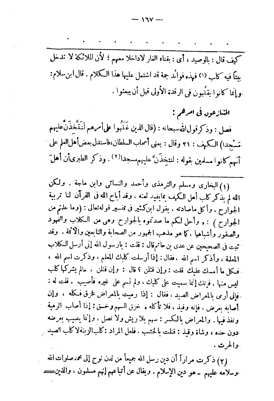 (1) البخارى ومسلم والترمذى وأحمد والنسائى وابن ماجة. ولكن الله لم يذكر كلب أهل الكهف بما يفيد لعنه، وقد أباح الله فى القرآن لنا تربية الجوارح، وأكل ما صادته، يقول ابن كثير فى تفسير قوله تعالى: (وما علمتم من الجوارح) : «وأحل لكم ما صدتموه بالجوارح وهى من الكلاب والفهود والصقور وأشباهها، كما هو مذهب الجمهور من الصحابة والتابعين والأئمة. وقد ثبت فى الصحيحين عن عدى بن حاتم قال: قلت: يا رسول الله إنى أرسل الكلاب المعلمة، وأذكر اسم الله، فقال: إذا أرسلت كلبك المعلم، وذكرت اسم الله، فكل ما أمسك عليك قلت: وإن قتلن؟ قال: وإن قتلن، ما لم يشركها كلب ليس منها، فإنك إنما سميت على كلبك، ولم تسم على غيره فأصيب. قلت له: فإنى أرمى بالمعراض الصيد، فقال: إذا رميت بالمعراض فخزق فكله، وإن أصابه بعرض، فإنه وقيذ، فلا تأكله، خزق السهم وخسق: إذا أصاب الرمية ونفذ فيها. والمعراض بالكسر: سهم بلا ريش ولا نصل، وإنما يصيب بعرضه دون حده، وشاة وقيذ: قتلت بالخشب. فلعل المراد: كلب الزبنة لا كلب الصيد والحرث.