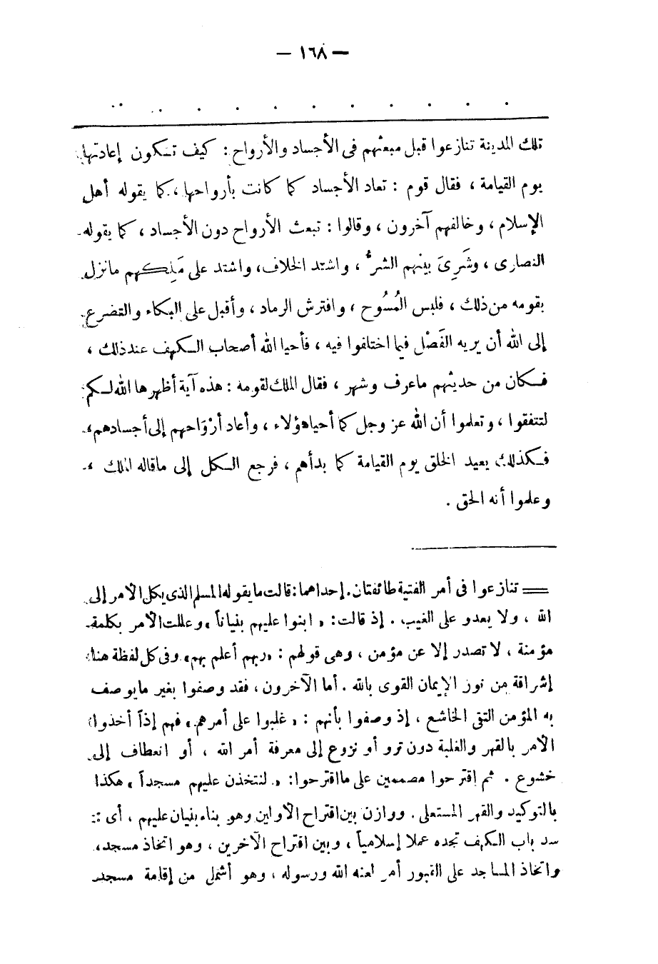 تِلْكَ الْمَدِينَةِ تَنَازَعُوا قَبْلَ مَبْعَثِهِمْ فِي الْأَجْسَادِ وَالْأَرْوَاحِ: كَيْفَ تَكُونُ إعَادَتُهَا يَوْمَ الْقِيَامَةِ، فَقَالَ قَوْمٌ: تُعَادُ الْأَجْسَادُ كَمَا كَانَتْ بِأَرْوَاحِهَا، كَمَا يَقُولُهُ أَهْلُ الْإِسْلَامِ، وَخَالَفَهُمْ آخَرُونَ، وَقَالُوا: تُبْعَثُ الْأَرْوَاحُ دُونَ الْأَجْسَادِ، كَمَا يَقُولُهُ النّصَارَى، وَشَرِيَ بَيْنَهُمْ الشّرّ، وَاشْتَدّ الْخِلَافُ، وَاشْتَدّ عَلَى مَلِكِهِمْ مَا نَزَلَ بِقَوْمِهِ مِنْ ذَلِكَ، فَلَبِسَ الْمُسُوحَ، وَافْتَرَشَ الرّمَادَ، وَأَقْبَلَ عَلَى الْبُكَاءِ وَالتّضَرّعِ إلَى اللهِ أَنْ يُرِيَهُ الْفَصْلَ فِيمَا اخْتَلَفُوا فِيهِ، فَأَحْيَا اللهُ أَصْحَابَ الْكَهْفِ عِنْدَ ذَلِكَ، فَكَانَ مِنْ حَدِيثِهِمْ مَا عُرِفَ وَشُهِرَ، فَقَالَ الْمَلِكُ لِقَوْمِهِ: هَذِهِ آيَةٌ أَظْهَرَهَا اللهُ لَكُمْ لِتَتّفِقُوا، وَتَعْلَمُوا أَنّ اللهَ عَزّ وَجَلّ كَمَا أَحْيَا هَؤُلَاءِ، وَأَعَادَ أَرْوَاحَهُمْ إلَى أَجْسَادِهِمْ، فَكَذَلِكَ يُعِيدُ الْخَلْقَ يَوْمَ الْقِيَامَةِ كَمَا بَدَأَهُمْ، فَرَجَعَ الْكُلّ إلَى مَا قَالَهُ الْمَلِكُ، وَعَلِمُوا أَنّهُ الْحَقّ.