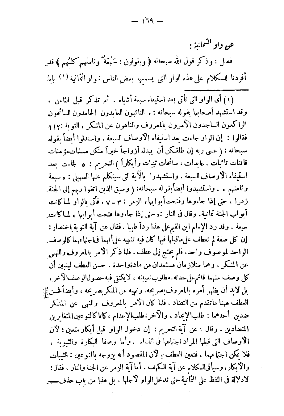 (1) أى الواو التى تأتى بعد استيفاء سبعة أشياء، ثم تذكر قبل الثامن، وقد استشهد أصحابها بقوله سبحانه: «التَّائِبُونَ الْعابِدُونَ الْحامِدُونَ السَّائِحُونَ الرَّاكِعُونَ السَّاجِدُونَ الْآمِرُونَ بِالْمَعْرُوفِ وَالنَّاهُونَ عَنِ الْمُنْكَرِ» التوبة: 112 فقالوا: إن الواو جاءت بعد استيفاء الأوصاف السبعة. واستدلوا أيضا بقوله سبحانه: (عَسى رَبُّهُ إِنْ طَلَّقَكُنَّ أَنْ يُبْدِلَهُ أَزْواجاً خَيْراً مِنْكُنَّ مُسْلِماتٍ مُؤْمِناتٍ قانِتاتٍ تائِباتٍ، عابِداتٍ، سائِحاتٍ ثَيِّباتٍ وَأَبْكاراً) التحريم: 5 فجاءت بعد استيفاء الأوصاف السبعة. واستشهدوا بالاية التى سيتكلم عنها السهيلى: «سبعة وثامنهم» . واستشهدوا أيضا بقوله سبحانه: (وَسِيقَ الَّذِينَ اتَّقَوْا رَبَّهُمْ إِلَى الْجَنَّةِ زُمَراً، حَتَّى إِذا جاؤُها وَفُتِحَتْ أَبْوابُها» الزمر: 3- 7. فأتى بالواو لما كانت أبواب الجنة ثمانية. وقال فى النار: «حتى إذا جاؤها فتحت أبوابها» لما كانت سبعة. وقد رد الإمام اين القيم على هذا ردا طيبا. فقال عن آية التوبة باختصار: إن كل صفة لم تعطف على ما قبلها فيها كان فيه تنبيه على أنهما فى اجتماعهما كالوصف الواحد لموصوف واحد، فلم يحتج إلى عطف. فلما ذكر الأمر بالمعروف والنهى عن المنكر، وهما متلازمان مستمدان من مادة واحدة، حسن العطف ليتبين أن كل وصف منهما قائم على حدته. مطلوب تعيينه، لا يكتفى فيه حصول الوصف الاخر، بل لابد أن يظهر أمره بالمعروف بصريحه، ونهيه عن المنكر بصريحه، وأيضا فحسن العطف ههنا ما تقدم من التضاد، فلما كان الأمر بالمعروف والنهى عن المنكر ضدين أحدهما: طلب الإيجاد، والاخر: طلب الإعدام، كانا كالنوعين المتغايرين المتضادين. وقال: عن آية التحريم: إن دخول الواو قبل أبكار متعين؛ لأن الأوصاف التى قبلها المراد اجتماعها فى النساء. وأما وصفا البكارة والثيوبة، فلا يمكن اجتماعهما، فتعين العطف؛ لأن المقصود أنه يزوجه بالنوعين: الثيبات والأبكار، وسيأتى الكلام عن آية الكهف. أما آية الزمر عن الجنة والنار، فقال: لا دلالة فى اللفظ على الثمانية حتى تدخل الواو لأجلها، بل هذا من باب حذف-