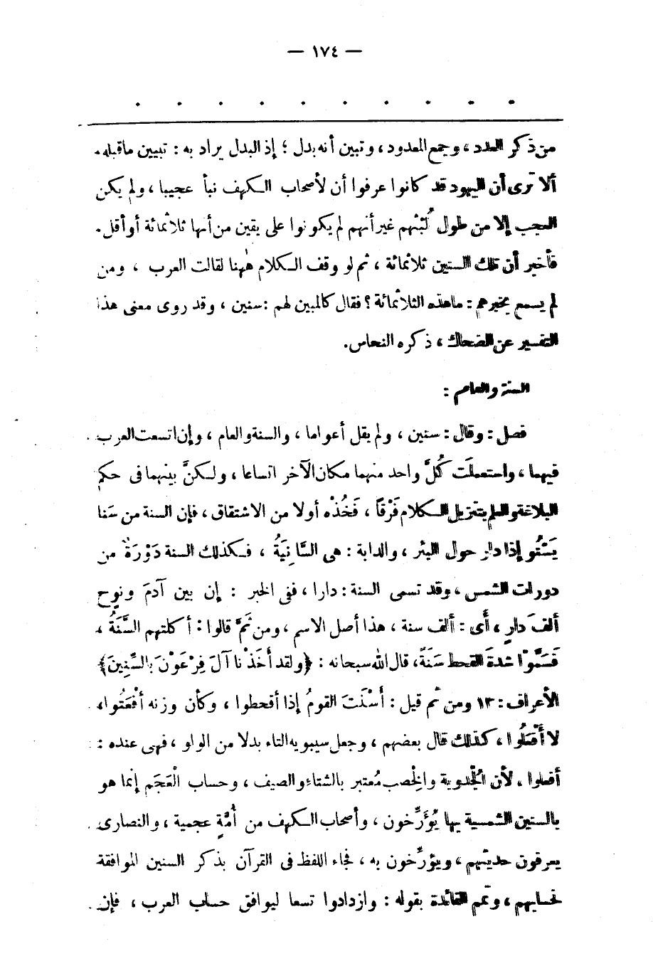 فَصْلٌ: وَقَالَ: سِنِينَ، وَلَمْ يَقُلْ أَعْوَامًا، وَالسّنَةُ وَالْعَامُ، وَإِنْ اتّسَعَتْ الْعَرَبُ فِيهِمَا، وَاسْتَعْمَلَتْ كُلّ وَاحِدٍ مِنْهُمَا مَكَانَ الْآخَرِ اتّسَاعًا، وَلَكِنْ بَيْنَهُمَا فِي حُكْمِ الْبَلَاغَةِ وَالْعِلْمِ بِتَنْزِيلِ الْكَلَامِ فَرْقًا، فَخُذْهُ أَوّلًا مِنْ الِاشْتِقَاقِ، فَإِنّ السّنَةَ مِنْ سَنَا يَسْنُو إذَا دَارَ حَوْلَ الْبِئْرِ، وَالدّابّةُ: هِيَ السّانِيَةُ، فَكَذَلِكَ السّنَةُ دَوْرَةٌ من دورات الشمس، وقد تُسَمّى السّنَةُ: دَارًا، فَفِي الْخَبَرِ: إنّ بَيْنَ آدَمَ وَنُوحٍ أَلْفَ دَارٍ، أَيْ: أَلْفَ سَنَةٍ، هَذَا أَصْلُ الِاسْمِ، وَمِنْ ثَمّ قَالُوا: أَكَلَتْهُمْ السّنَةُ، فَسَمّوْا شِدّةَ الْقَحْطِ سَنَةً، قَالَ اللهُ سُبْحَانَهُ: وَلَقَدْ أَخَذْنا آلَ فِرْعَوْنَ بِالسِّنِينَ الْأَعْرَافِ: 13 وَمِنْ ثَمّ قِيلَ: أَسْنَتَ الْقَوْمُ إذَا أَقْحَطُوا، وَكَأَنّ وَزْنَهُ أَفْعَتُوا، لَا أَفْعَلُوا، كَذَلِكَ قَالَ بَعْضُهُمْ، وَجَعَلَ سِيبَوَيْهِ التّاءَ بَدَلًا مِنْ الْوَاوِ، فَهِيَ عِنْدَهُ: