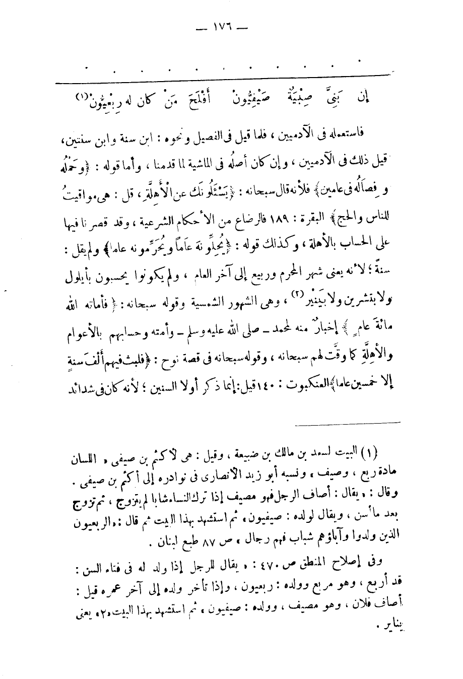 سَنَةً؛ لِأَنّهُ يَعْنِي شَهْرَ الْمُحَرّمِ وَرَبِيعَ إلَى آخِرِ الْعَامِ، وَلَمْ يَكُونُوا يَحْسِبُونَ بِأَيْلُول وَلَا بِتِشْرِين وَلَا بينير «2» ، وَهِيَ الشّهُورُ الشّمْسِيّةُ وَقَوْلُهُ سُبْحَانَهُ: فَأَماتَهُ اللَّهُ مِائَةَ عامٍ إخْبَارٌ مِنْهُ لِمُحَمّدِ- صَلَّى اللَّهُ عَلَيْهِ وَسَلَّمَ- وَأُمّتِهِ وَحِسَابُهُمْ بِالْأَعْوَامِ وَالْأَهِلّةِ كَمَا وَقّتَ لَهُمْ سُبْحَانَهُ، وَقَوْلُهُ سُبْحَانَهُ فِي قِصّةِ نُوحٍ: فَلَبِثَ فِيهِمْ أَلْفَ سَنَةٍ إِلَّا خَمْسِينَ عَامًا الْعَنْكَبُوتِ: 140 قِيلَ: إنّمَا ذَكَرَ أَوّلًا السّنِينَ؛ لِأَنّهُ كَانَ فى شدائد