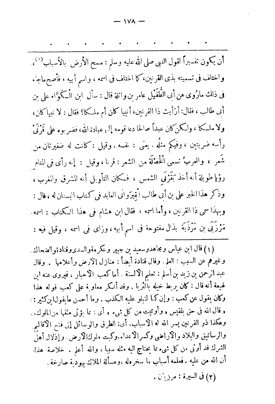 (1) قال ابن عباس ومجاهد وسعيد بن جبير وعكرمة والسدى وقنادة والضحاك وغيرهم عن السبب: العلم. وقال قتادة أيضا: منازل الأرض وأعلامها. وقال عبد الرحمن بن زيد بن أسلم: تعليم الألسنة. أما كعب الأحبار، فيروى عنه ابن لهيعة أنه قال: كان يربط خيله بالثريا. وقد أنكر معاوية على كعب قوله هذا وكان يقول عن كعب: وإن كنا لتبلو عليه الكذب. وما أحسن ما يقول ابن كثير: «قال الله فى حق بلقيس «وأوتيت من كل شىء» أى: مما يؤتى مثلها من الملوك، وهكذا ذو القرنين يسر الله له الأسباب، أى: الطرق والوسائل إلى فتح الأقاليم والرساتيق والبلاد والأراضى وكسر الأعداء، وكبت ملوك الأرض. وإذلال أهل الشرك قد أوتى من كل شىء مما يحتاج اليه مثله سببا، والله أعلم. خلاصة هذا أن الله من عليه. فعلمه أسباب ما سخره له، ومسألة الملاك يهودية صارخة.