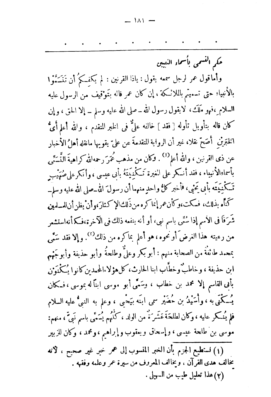 حُكْمُ التّسَمّي بِأَسْمَاءِ النّبِيّينَ وَأَمّا قَوْلُ عُمَرَ لِرَجُلِ سَمِعَهُ يَقُولُ: يَا ذَا الْقَرْنَيْنِ: لَمْ يَكْفِكُمْ أَنْ تَتَسَمّوْا بِالْأَنْبِيَاءِ حَتّى تَسَمّيْتُمْ بِالْمَلَائِكَةِ، إنْ كَانَ عُمَرُ قَالَهُ بِتَوْقِيفِ مِنْ الرّسُولِ عَلَيْهِ السّلَامُ، فَهُوَ مَلَكٌ، لَا يَقُولُ رَسُولُ اللهِ- صَلَّى اللَّهُ عَلَيْهِ وَسَلَّمَ- إلّا الْحَقّ، وَإِنْ كَانَ قَالَهُ بِتَأْوِيلِ تَأَوّلَهُ [فَقَدْ] خَالَفَهُ عَلِيّ فِي الْخَبَرِ الْمُتَقَدّمِ، وَاَللهُ أَعْلَمُ أَيّ الْخَبَرَيْنِ أَصَحّ نَقْلًا، غَيْرَ أَنّ الرّوَايَةَ الْمُتَقَدّمَةَ عَنْ عَلِيّ يُقَوّيهَا مَا نَقَلَهُ أَهْلُ الْأَخْبَارِ عَنْ ذِي الْقَرْنَيْنِ، وَاَللهُ أَعْلَمُ «1» . وَكَانَ مِنْ مَذْهَبِ عُمَرَ رَحِمَهُ اللهُ كَرَاهِيَةُ التّسَمّي بِأَسْمَاءِ الْأَنْبِيَاءِ، فَقَدْ أَنْكَرَ عَلَى الْمُغِيرَةِ تَكْنِيَتُهُ بِأَبِي عِيسَى، وَأَنْكَرَ عَلَى صُهَيْبٍ تَكْنِيَتَهُ بِأَبِي يَحْيَى، فَأَخْبَرَ كُلّ وَاحِدٍ مِنْهُمَا أَنّ رَسُولَ اللهِ- صَلَّى اللَّهُ عَلَيْهِ وَسَلَّمَ- كَنّاهُ بِذَلِكَ، فَسَكَتَ، وَكَانَ عُمَرُ إنّمَا كَرِهَ مِنْ ذَلِكَ الْإِكْثَارَ، وَأَنْ يَظُنّ أَنّ لِلْمُسْلِمِينَ شَرَفًا فِي الِاسْمِ إذَا سُمّيَ بِاسْمِ نَبِيّ، أَوْ أَنّهُ يَنْفَعُهُ ذَلِكَ فِي الْآخِرَةِ، فَكَأَنّهُ اسْتَشْعَرَ مِنْ رَعِيّتِهِ هَذَا الْغَرَضَ أَوْ نَحْوَهُ، هُوَ أَعْلَمُ بِمَا كَرِهَ مِنْ ذَلِكَ «2» . وَإِلّا فَقَدْ سَمّى بِمُحَمّدِ طَائِفَةٌ مِنْ الصّحَابَةِ مِنْهُمْ: أَبُو بَكْرٍ وَعَلِيّ وطلحة وأبو حذيفة وأبو جهم ابن حُذَيْفَةَ، وَخَاطِبٌ وَخَطّابٌ ابْنَا الْحَارِثِ، كُلّ هَؤُلَاءِ الْمُحَمّدِينَ كَانُوا يُكَنّونَ بِأَبِي الْقَاسِمِ إلّا مُحَمّدَ بْنَ خَطّابٍ، وَسَمّى أَبُو مُوسَى ابْنًا لَهُ بِمُوسَى، فَكَانَ يُكَنّى بِهِ، وَأُسَيْدُ بْنُ حُضَيْرٍ سَمّى ابْنَهُ بِيَحْيَى، وَعَلِمَ بِهِ النّبِيّ عَلَيْهِ السّلَامُ فَلَمْ يُنْكِرْ عَلَيْهِ، وَكَانَ لِطَلْحَةِ عَشَرَةٌ مِنْ الْوَلَدِ، كُلّهُمْ يُسَمّى بِاسْمِ نَبِيّ، مِنْهُمْ: