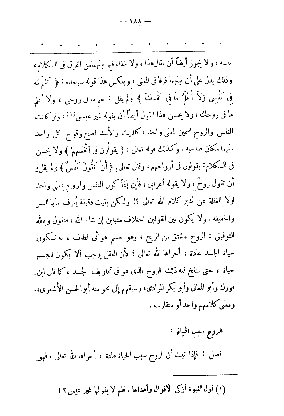 أَنْ تَقُولَ رُوحٌ، وَلَا يَقُولُهُ أَعْرَابِيّ، فَأَيْنَ إذًا كَوْنُ النّفْسِ وَالرّوحِ بِمَعْنَى وَاحِدٍ لَوْلَا الْغَفْلَةُ عَنْ تَدَبّرِ كَلَامِ اللهِ تعالى؟! ولكن بقيت دقيقة يعرف منها السّرّ وَالْحَقِيقَةُ، وَلَا يَكُونُ بَيْنَ الْقَوْلَيْنِ اخْتِلَافٌ مُتَبَايِنٌ إنْ شَاءَ اللهُ، فَنَقُولُ وَبِاَللهِ التّوْفِيقُ: الرّوحُ مُشْتَقّ مِنْ الرّيحِ، وَهُوَ جِسْمٌ هَوَائِيّ لَطِيفٌ، بِهِ تَكُونُ حَيَاةُ الْجَسَدِ عَادَةً، أَجْرَاهَا اللهُ تَعَالَى؛ لِأَنّ الْعَقْلَ يُوجِبُ أَلّا يَكُونَ لِلْجِسْمِ حَيَاةٌ، حَتّى يُنْفَخَ فِيهِ ذَلِكَ الرّوحُ الّذِي هُوَ فِي تَجَاوِيفِ الْجَسَدِ، كَمَا قَالَ ابْنُ فُورَكٍ وَأَبُو الْمَعَالِي وَأَبُو بَكْرٍ الْمُرَادِيّ، وَسَبَقَهُمْ إلَى نَحْوٍ مِنْهُ أَبُو الْحَسَنِ الْأَشْعَرِيّ، وَمَعْنَى كَلَامِهِمْ وَاحِدٌ أَوْ مُتَقَارِبٌ.