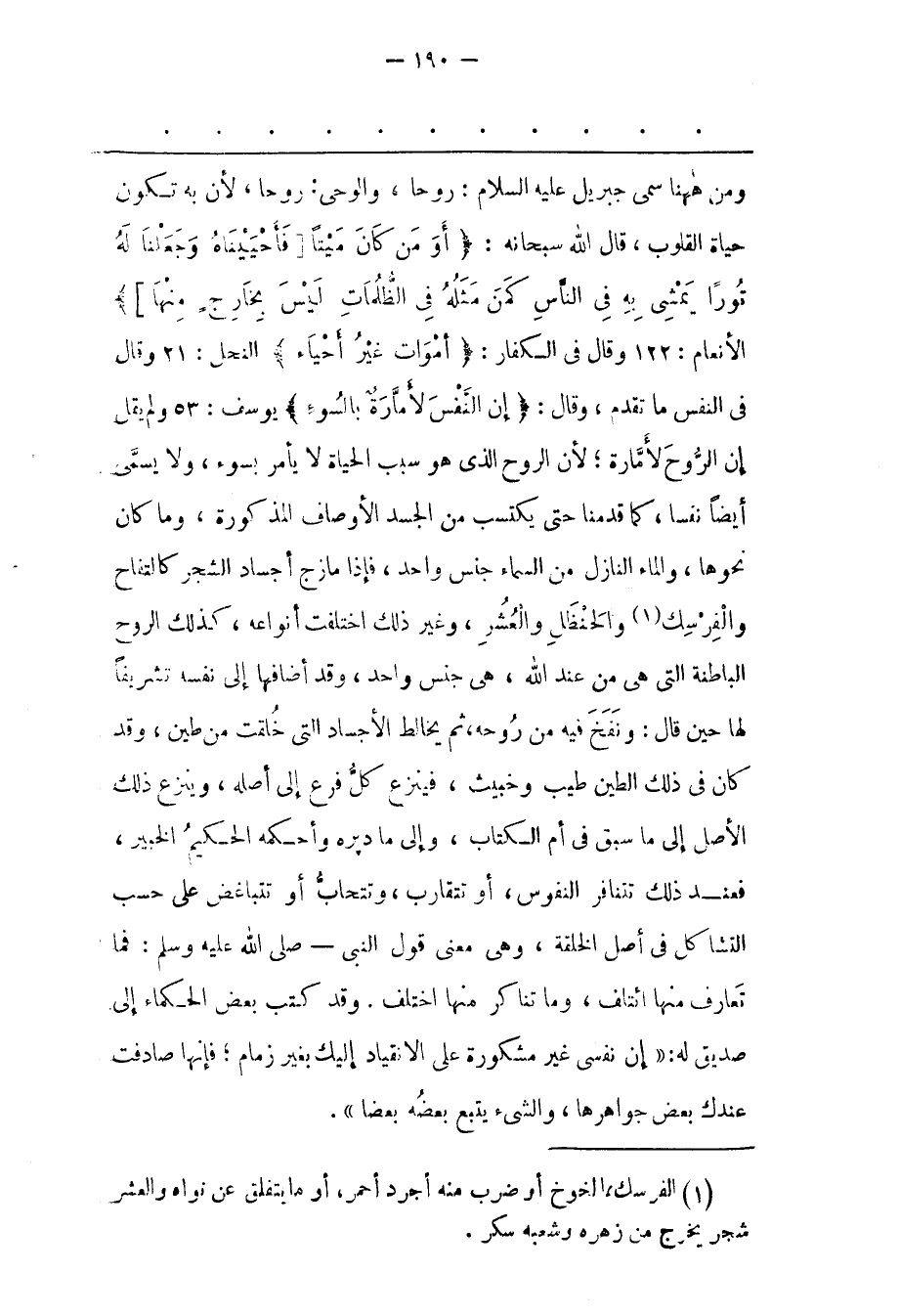 وَمِنْ هَهُنَا سُمّيَ جِبْرِيلُ عَلَيْهِ السّلَامُ: رُوحًا، وَالْوَحْيُ: رُوحًا، لِأَنّ بِهِ تَكُونُ حَيَاةُ الْقُلُوبِ، قَالَ اللهُ سُبْحَانَهُ: أَوَمَنْ كانَ مَيْتاً [فَأَحْيَيْناهُ وَجَعَلْنا لَهُ نُوراً يَمْشِي بِهِ فِي النَّاسِ كَمَنْ مَثَلُهُ فِي الظُّلُماتِ لَيْسَ بِخارِجٍ مِنْها] الْأَنْعَامِ: 122 وَقَالَ فِي الْكُفّارِ: أَمْواتٌ غَيْرُ أَحْياءٍ النّحْلِ: 21 وَقَالَ فِي النّفْسِ مَا تَقَدّمَ، وَقَالَ: إِنَّ النَّفْسَ لَأَمَّارَةٌ بِالسُّوءِ يُوسُفَ: 53 وَلَمْ يَقُلْ إنّ الرّوحَ لَأَمّارَةٌ؛ لِأَنّ الرّوحَ الّذِي هُوَ سَبَبُ الْحَيَاةِ لَا يَأْمُرُ بِسُوءِ، وَلَا يُسَمّى أَيْضًا نَفْسًا، كَمَا قَدّمْنَا حَتّى يَكْتَسِبَ مِنْ الْجَسَدِ الْأَوْصَافَ الْمَذْكُورَةَ، وَمَا كَانَ نَحْوَهَا، وَالْمَاءُ النّازِلُ مِنْ السّمَاءِ جِنْس وَاحِدٌ، فَإِذَا مَازَجَ أَجْسَادَ الشّجَرِ كَالتّفّاحِ وَالْفِرْسِكِ «1» وَالْحَنْظَلِ وَالْعُشُرِ، وَغَيْرِ ذَلِكَ اخْتَلَفَتْ أَنْوَاعُهُ، كَذَلِكَ الرّوحُ الْبَاطِنَةُ الّتِي هِيَ مِنْ عِنْدِ اللهِ، هِيَ جِنْسٌ وَاحِدٌ، وَقَدْ أَضَافَهَا إلَى نَفْسِهِ تَشْرِيفًا لَهَا حِينَ قال: ونفخ فيه من روحه، ثُمّ يُخَالِطُ الْأَجْسَادَ الّتِي خُلِقَتْ مِنْ طِينٍ، وَقَدْ كَانَ فِي ذَلِكَ الطّينِ طَيّبٌ وَخَبِيثٌ، فَيَنْزِعُ كُلّ فَرْعٍ إلَى أَصْلِهِ، وَيَنْزِعُ ذَلِكَ الْأَصْلُ إلَى مَا سَبَقَ فِي أُمّ الْكِتَابِ، وَإِلَى مَا دَبّرَهُ وَأَحْكَمَهُ الْحَكِيمُ الْخَبِيرُ، فَعِنْدَ ذَلِكَ تَتَنَافَرُ النّفُوسُ، أَوْ تَتَقَارَبُ، وَتَتَحَابّ أَوْ تَتَبَاغَضُ عَلَى حَسَبِ التّشَاكُلِ فِي أَصْلِ الْخِلْقَةِ، وَهِيَ مَعْنَى قَوْلِ النّبِيّ- صَلَّى اللَّهُ عَلَيْهِ وَسَلَّمَ: فَمَا تَعَارَفَ مِنْهَا ائْتَلَفَ، وَمَا تَنَاكَرَ مِنْهَا اخْتَلَفَ. وَقَدْ كَتَبَ بَعْضُ الْحُكَمَاءِ إلَى صَدِيقٍ لَهُ: «إنّ نَفْسِي غَيْرُ مَشْكُورَةٍ عَلَى الِانْقِيَادِ إلَيْك بِغَيْرِ زِمَامٍ؛ فَإِنّهَا صَادَفَتْ عِنْدَك بعض جواهرها، والشىء يتبع بعضه بعضا» .