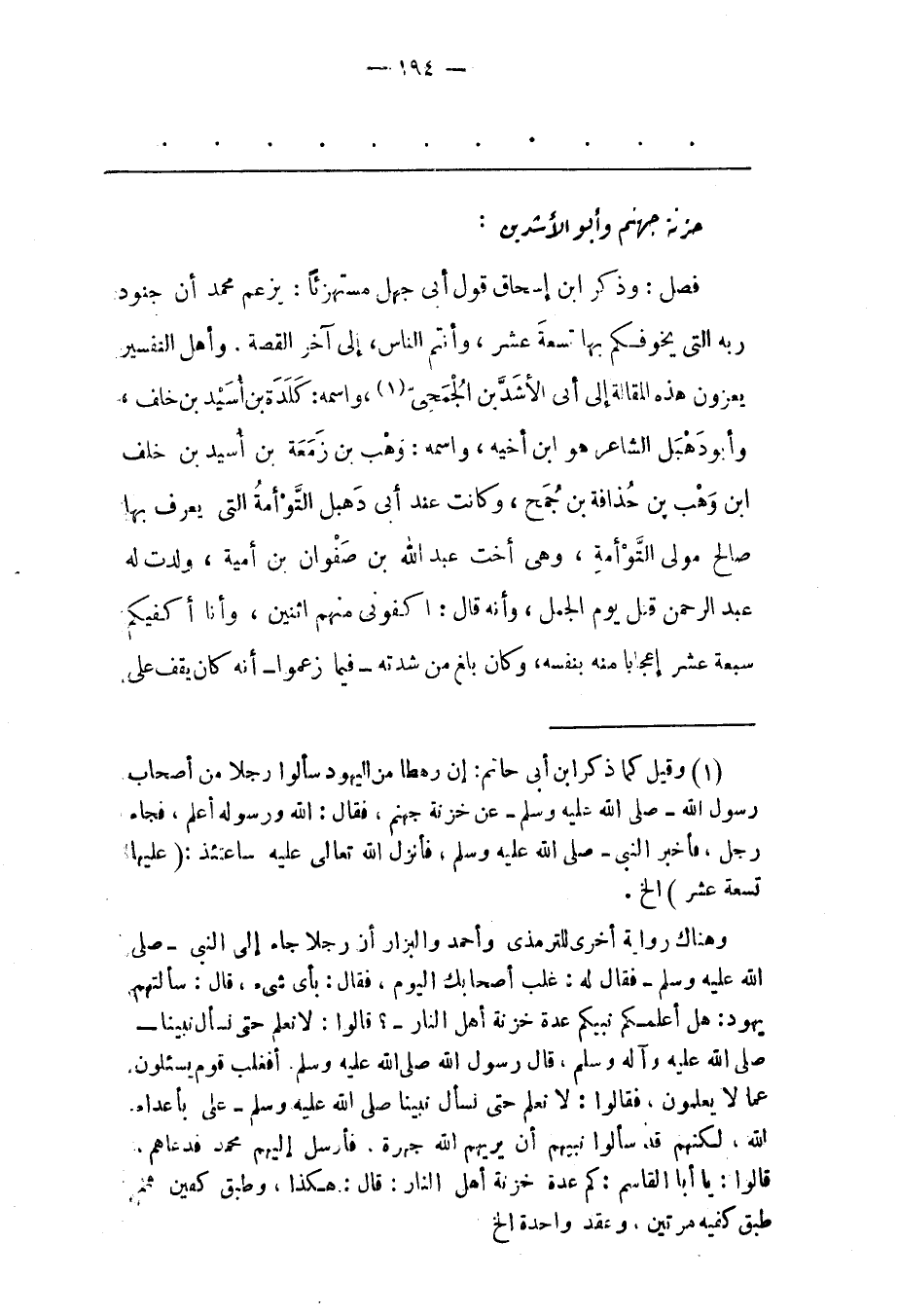 فَصْلٌ: وَذَكَرَ ابْنُ إسْحَاقَ قَوْلَ أَبِي جَهْلٍ مُسْتَهْزِئًا: يَزْعُمُ مُحَمّدٌ أَنّ جُنُودَ رَبّهِ الّتِي يُخَوّفُكُمْ بِهَا تِسْعَةَ عَشَرَ، وَأَنْتُمْ النّاسُ، إلَى آخِرِ الْقِصّةِ. وَأَهْلُ التّفْسِيرِ يَعْزُونَ هَذِهِ الْمَقَالَةَ إلى أبى الأشدّ بن الْجُمَحِيّ «1» ، وَاسْمُهُ: كَلَدَةُ بْنُ أُسَيْدِ بْنِ خَلَفٍ، وَأَبُو دَهْبَلٍ الشّاعِرُ هُوَ ابْنُ أَخِيهِ، وَاسْمُهُ: وَهْبُ بْنُ زَمَعَةَ بْنِ أُسَيْدِ بْنِ خَلَفِ ابن وَهْبِ بْنِ حُذَافَةَ بْنِ جُمَحَ، وَكَانَتْ عِنْدَ أَبِي دَهْبَلٍ التّوْأَمَةُ الّتِي يَعْرِفُ بِهَا صَالِحٌ مَوْلَى التّوْأَمَةِ، وَهِيَ أُخْتُ عَبْدِ اللهِ بْنِ صَفْوَانَ بْنِ أُمَيّةَ، وَلَدَتْ لَهُ عَبْدَ الرّحْمَنِ قُتِلَ يَوْمَ الْجَمَلِ، وَأَنّهُ قَالَ: اكْفُونِي مِنْهُمْ اثْنَيْنِ، وَأَنَا أَكْفِيكُمْ سَبْعَةَ عَشَرَ إعْجَابًا مِنْهُ بِنَفْسِهِ، وَكَانَ بَلَغَ مِنْ شِدّتِهِ- فِيمَا زَعَمُوا- أنه كان يقف على