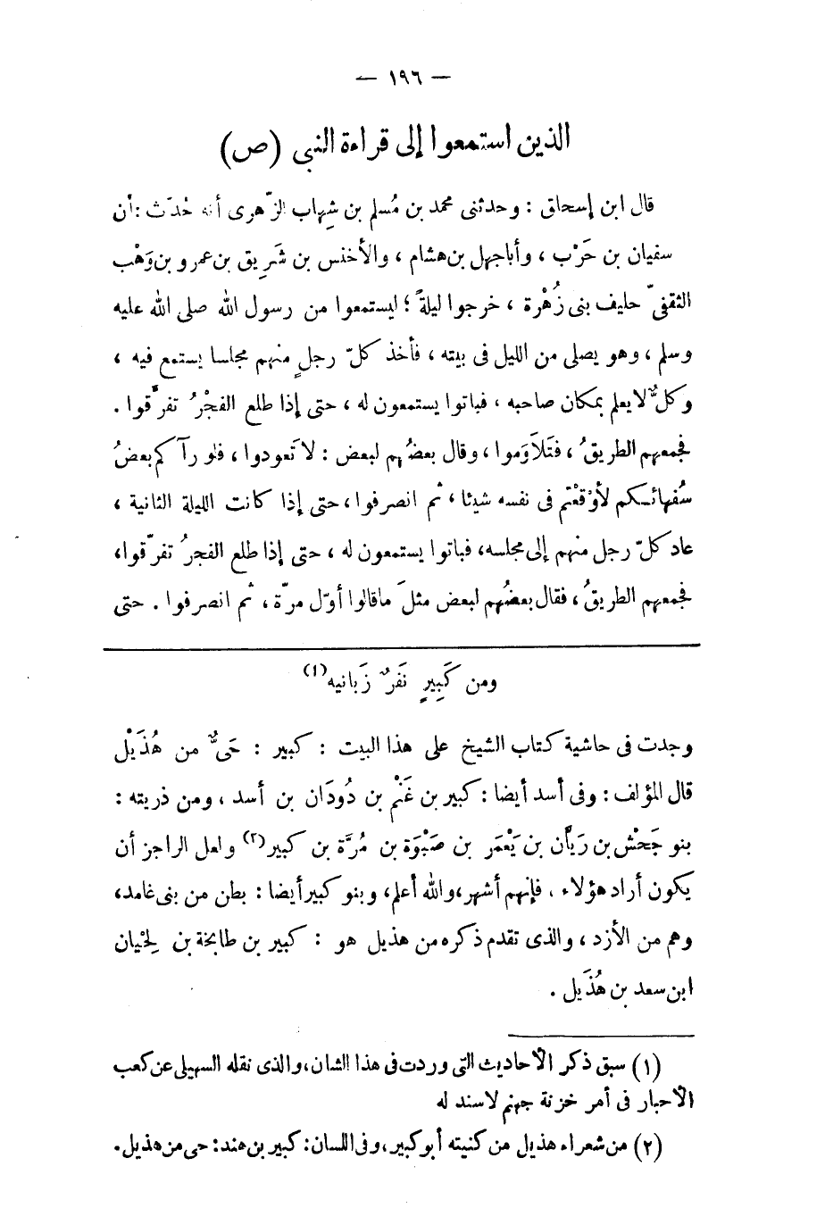 قَالَ ابْنُ إسْحَاقَ: وَحَدّثَنِي مُحَمّدُ بْنُ مُسْلِمِ بْنِ شِهَابٍ الزّهْرِيّ أَنّهُ حُدّثَ: أَنّ أَبَا سُفْيَانَ بْنَ حَرْبٍ، وَأَبَا جَهْلِ بْنَ هِشَامٍ، وَالْأَخْنَسَ بْنَ شَرِيقِ بْنِ عَمْرِو بْنِ وَهْبٍ الثّقَفِيّ حَلِيفَ بَنِي زُهْرَةَ، خَرَجُوا لَيْلَةً؛ لِيَسْتَمِعُوا مِنْ رَسُولِ اللهِ صَلَّى اللَّهُ عَلَيْهِ وَسَلَّمَ، وهو يصلى من الليل مِنْ اللّيْلِ فِي بَيْتِهِ، فَأَخَذَ كُلّ رَجُلٍ مِنْهُمْ مَجْلِسًا يَسْتَمِعُ فِيهِ، وَكُلّ لَا يَعْلَمُ بِمَكَانِ صَاحِبِهِ، فَبَاتُوا يَسْتَمِعُونَ لَهُ، حَتّى إذَا طَلَعَ الْفَجْرُ تَفَرّقُوا.