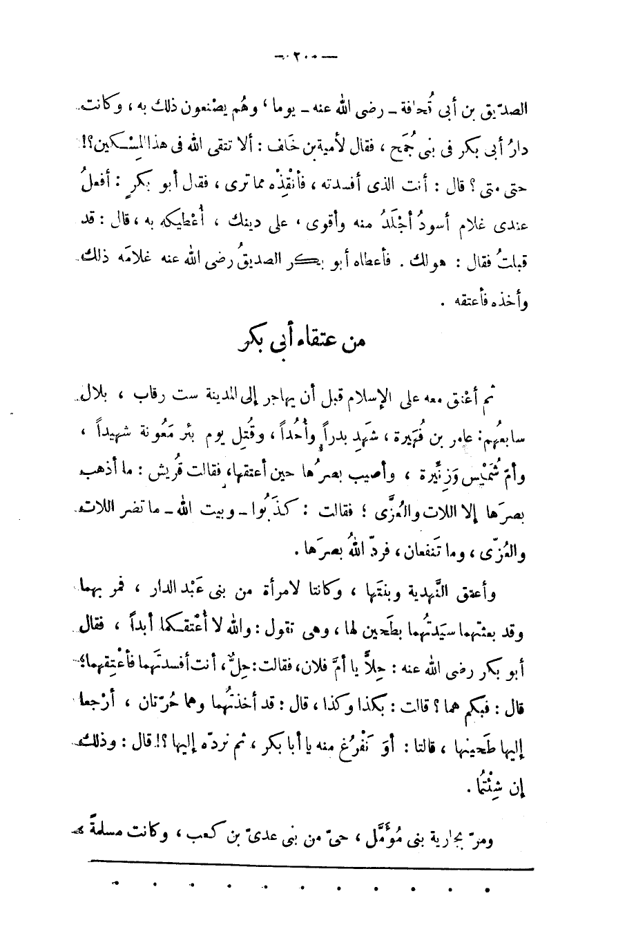 الصدّيق بن أبى تحافة- رَضِيَ اللهُ عَنْهُ- يَوْمًا، وَهُمْ يَصْنَعُونَ ذَلِكَ بِهِ، وَكَانَتْ دَارُ أَبِي بَكْرٍ فِي بَنِي جُمَحٍ، فَقَالَ لِأُمَيّةِ بْنِ خَلَفٍ: أَلَا تَتّقِي اللهَ فِي هَذَا الْمِسْكِينِ؟! حَتّى مَتَى؟ قَالَ: أَنْت الّذِي أَفْسَدْته، فَأَنْقِذْهُ مِمّا تَرَى، فَقَالَ أَبُو بَكْرٍ: أَفْعَلُ عِنْدِي غُلَامٌ أَسْوَدُ أَجْلَدُ مِنْهُ وَأَقْوَى، عَلَى دِينِك، أُعْطِيكَهُ بِهِ، قَالَ: قَدْ قَبِلْتُ فَقَالَ: هُوَ لَك. فَأَعْطَاهُ أَبُو بَكْرٍ الصّدّيقُ رَضِيَ اللهُ عَنْهُ غُلَامَهُ ذَلِكَ وأخذه فأعتقه.