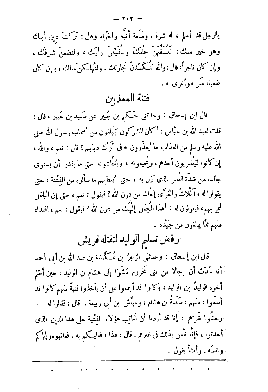 قَالَ ابْنُ إسْحَاقَ: وَحَدّثَنِي الزّبَيْرُ بْنُ عُكَاشَةَ بْنِ عَبْدِ اللهِ بْنِ أَبِي أَحْمَدَ أَنّهُ حُدّثَ أَنّ رِجَالًا مِنْ بَنِي مَخْزُومٍ مَشَوْا إلَى هِشَامِ بْنِ الْوَلِيدِ، حِينَ أَسْلَمَ أَخُوهُ الوليد بن الوليد، وَكَانُوا قَدْ أَجْمَعُوا عَلَى أَنْ يَأْخُذُوا فِتْيَةً مِنْهُمْ كَانُوا قَدْ أَسْلَمُوا، مِنْهُمْ: سَلَمَةُ بْنُ هِشَامٍ، وَعَيّاشُ بْنُ أَبِي رَبِيعَةَ. قَالَ: فَقَالُوا لَهُ- وَخَشُوا شَرّهُمْ: إنّا قَدْ أَرَدْنَا أَنْ نعاقب هَؤُلَاءِ الْفِتْيَةِ عَلَى هَذَا الدّينِ الّذِي أَحْدَثُوا، فَإِنّا نَأْمَنُ بِذَلِكَ فِي غَيْرِهِمْ. قَالَ: هَذَا، فَعَلَيْكُمْ بِهِ. فَعَاتِبُوهُ وَإِيّاكُمْ وَنَفْسَهُ. وَأَنْشَأَ يَقُول: