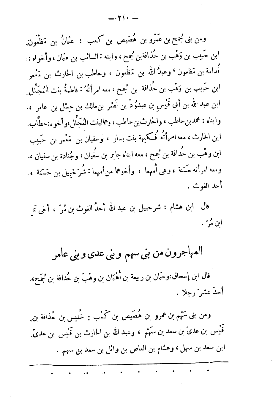 وَمِنْ بَنِي سَهْمِ بْنِ عَمْرِو بْنِ هُصَيْصِ بْنِ كَعْبِ: خُنَيْسُ بْنُ حُذَافَةَ بْنِ قَيْسِ بْنِ عَدِيّ بْنِ سَعْدِ بْنِ سَهْمٍ، وَعَبْدُ اللهِ بْنُ الْحَارِثِ بْنِ قيس بن عدىّ ابن سَعْدِ بْنِ سَهْلٍ، وَهِشَامُ بْنُ الْعَاصِ بْنِ وَائِلِ بْنِ سَعْدِ بْنِ سَهْمٍ.