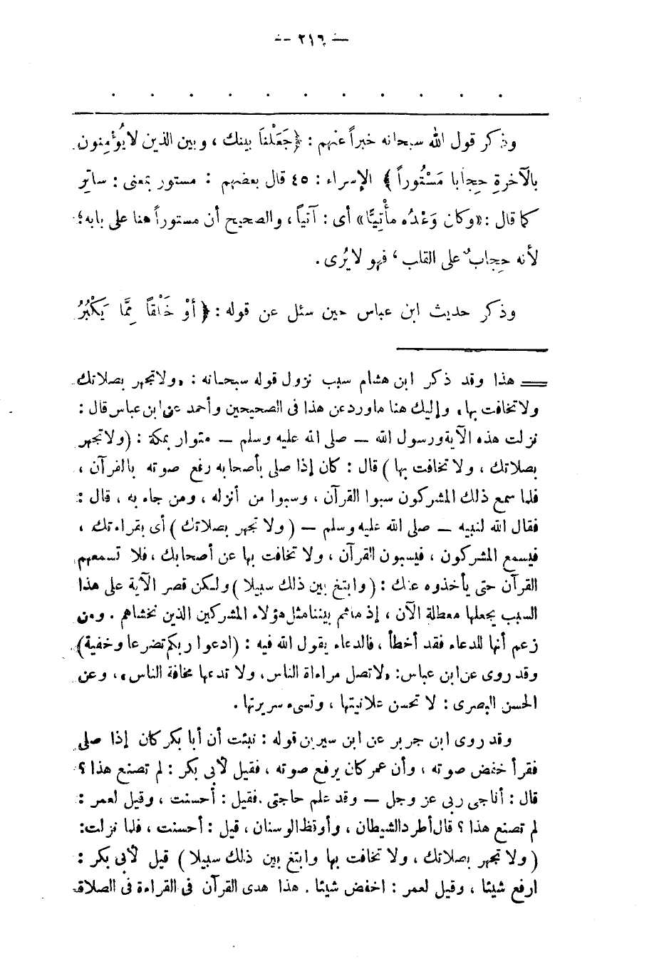 - هذا وقد ذكر ابن هشام سبب نزول قوله سبحانه: «وَلا تَجْهَرْ بِصَلاتِكَ وَلا تُخافِتْ بِها» وإليك هنا ما ورد عن هذا فى الصحيحين وأحمد عن ابن عباس قال: نزلت هذه الاية ورسول الله- صلّى الله عليه وسلم- متوار بمكة: (وَلا تَجْهَرْ بِصَلاتِكَ، وَلا تُخافِتْ بِها) قال: كان إذا صلّى بأصحابه رفع صوته بالقرآن، فلما سمع ذلك المشركون سبوا القرآن، وسبوا من أنزله، ومن جاء به، قال: فقال الله لنبيه- صلّى الله عليه وسلم- (ولا تجهر بصلاتك) أى بقراءتك، فيسمع المشركون، فيسبون القرآن، ولا تخافت بها عن أصحابك، فلا تسمعهم القرآن حتى يأخذوه عنك: (وابتغ بين ذلك سبيلا) ولكن قصر الاية على هذا السبب يجعلها معطلة الان، إذ ما ثم بيننا مثل هؤلاء المشركين الذين نخشاهم. ومن زعم أنها للدعاء فقد أخطأ، فالدعاء يقول الله فيه: (ادعوا ربكم تضرعا وخفية) وقد روى عن ابن عباس: «لا تصل مراآة الناس، ولا تدعها مخافة الناس» ، وعن الحسن البصرى: لا تحسن علانيتها، وتسىء سريرتها. وقد روى ابن جرير عن ابن سير بن قوله: نبئت أن أبا بكر كان إذا صلى فقرأ خفض صوته، وأن عمر كان يرفع صوته، فقيل لأبى بكر: لم تصنع هذا؟ قال: أناجى ربى عز وجل- وقد علم حاجتى، فقيل: أحسنت، وقيل لعمر: لم تصنع هذا؟ قال أطرد الشيطان، وأوقظ الوسنان، قيل: أحسنت، فلما نزلت: (ولا تجهر بصلاتك، ولا تخافت بها وابتغ بين ذلك سبيلا) قيل لأبى بكر: ارفع شيئا، وقيل لعمر: اخفض شيئا. هذا هدى القرآن فى القراءة فى الصلاة