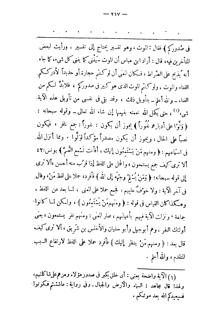 فِي صُدُورِكُمْ فَقَالَ: الْمَوْتَ، وَهُوَ تَفْسِيرٌ يَحْتَاجُ إلَى تَفْسِيرٍ، وَرَأَيْت لِبَعْضِ الْمُتَأَخّرِينَ فِيهِ، قَالَ: أَرَادَ ابْنُ عَبّاسٍ أَنّ الْمَوْتَ سَيَفْنَى كَمَا يَفْنَى كُلّ شَيْءٍ، كَمَا جَاءَ أَنّهُ يُذْبَحُ عَلَى الصّرَاطِ، فَكَانَ الْمَعْنَى أَنْ لَوْ كُنْتُمْ حِجَارَةً أَوْ حَدِيدًا لَأَدْرَكَكُمْ الْفَنَاءُ وَالْمَوْتُ، وَلَوْ كُنْتُمْ الْمَوْتَ الّذِي هُوَ كَبِيرٌ فِي صُدُورِكُمْ، فَلَا بُدّ لَكُمْ مِنْ الْفَنَاءِ- وَاَللهُ أَعْلَمُ- بِتَأْوِيلِ ذَلِكَ، وَقَدْ بَقِيَ فِي نَفْسِي مِنْ تَأْوِيلِ هَذِهِ الْآيَةِ شَيْءٌ «1» ، حَتّى يُكْمِلَ اللهُ نِعْمَتَهُ بِفَهْمِهَا إنْ شَاءَ اللهُ تَعَالَى- وَقَوْلُهُ سُبْحَانَهُ: