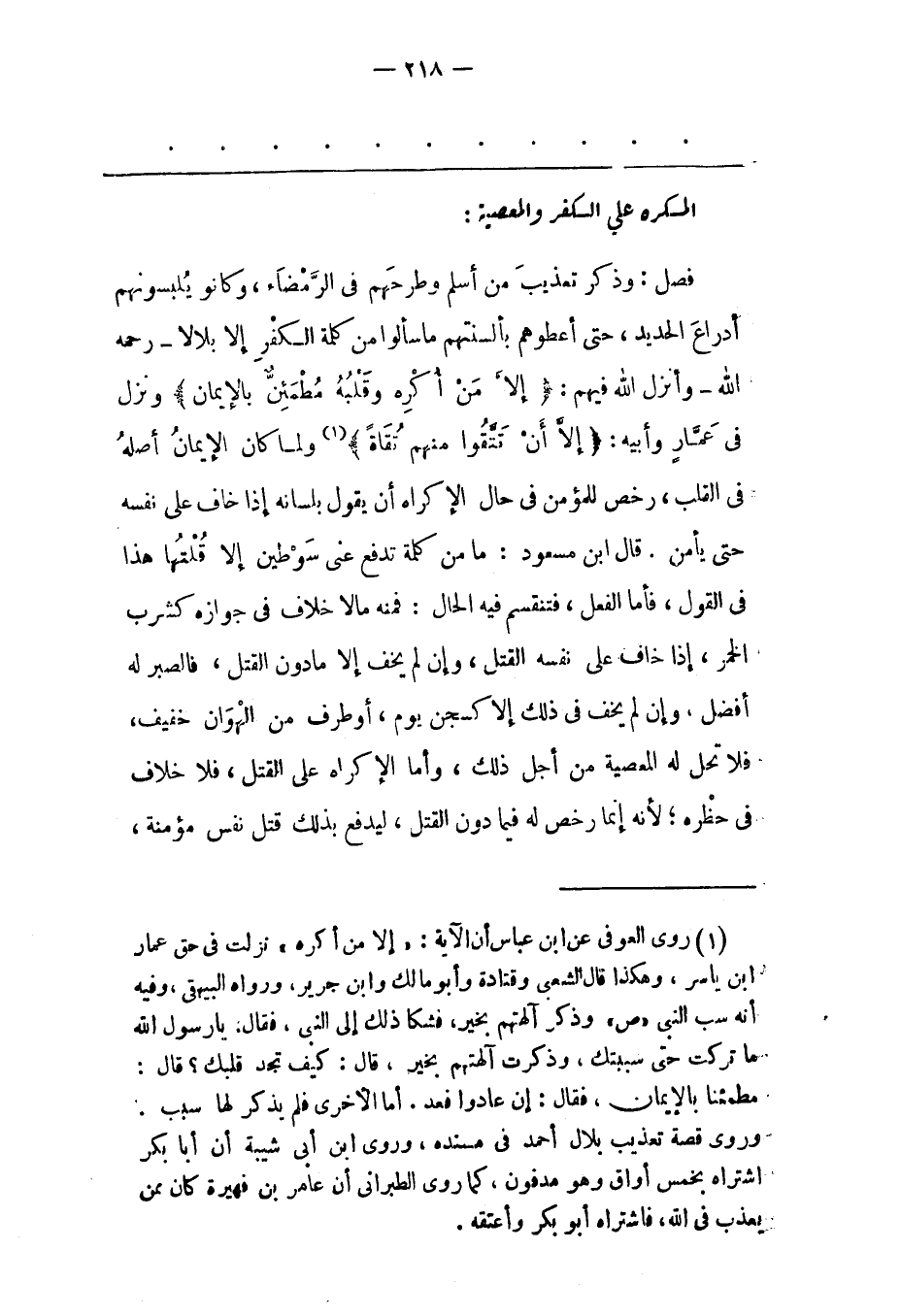 فَصْلٌ: وَذَكَرَ تَعْذِيبَ مَنْ أَسْلَمَ وَطَرْحَهُمْ فِي الرّمْضَاءِ، وَكَانُوا يُلْبِسُونَهُمْ أَدْرَاعَ الْحَدِيدِ، حَتّى أَعْطَوْهُمْ بِأَلْسِنَتِهِمْ مَا سَأَلُوا مِنْ كَلِمَةِ الْكُفْرِ إلّا بِلَالًا- رَحِمَهُ اللهُ- وَأَنْزَلَ اللهُ فِيهِمْ: إِلَّا مَنْ أُكْرِهَ وَقَلْبُهُ مُطْمَئِنٌّ بِالْإِيمانِ وَنَزَلَ فِي عَمّارٍ وَأَبِيهِ: إِلَّا أَنْ تَتَّقُوا مِنْهُمْ تُقاةً «1» وَلَمّا كَانَ الْإِيمَانُ أَصْلُهُ فِي الْقَلْبِ، رَخّصَ لِلْمُؤْمِنِ فِي حَالِ الْإِكْرَاهِ أَنْ يَقُولَ بِلِسَانِهِ إذَا خَافَ عَلَى نَفْسِهِ حَتّى يَأْمَنَ. قَالَ ابْنُ مَسْعُودٍ: مَا مِنْ كَلِمَةٍ تَدْفَعُ عَنّي سَوْطَيْنِ إلّا قُلْتهَا هَذَا فِي الْقَوْلِ، فَأَمّا الْفِعْلُ، فَتَنْقَسِمُ فِيهِ الْحَالُ: فَمِنْهُ مَا لَا خِلَافَ فِي جَوَازِهِ كَشُرْبِ الْخَمْرِ، إذَا خَافَ عَلَى نَفْسِهِ الْقَتْلَ، وَإِنْ لَمْ يَخَفْ إلّا مَا دُونَ الْقَتْلِ، فَالصّبْرُ لَهُ أَفْضَلُ، وَإِنْ لَمْ يَخَفْ فِي ذَلِكَ إلّا كَسَجْنِ يَوْمٍ، أَوْ طَرَفٍ مِنْ الْهَوَانِ خَفِيفٍ، فَلَا تَحِلّ لَهُ الْمَعْصِيَةُ مِنْ أَجْلِ ذَلِكَ، وَأَمّا الْإِكْرَاهُ عَلَى الْقَتْلِ، فَلَا خِلَافَ فِي حَظْرِهِ؛ لِأَنّهُ إنّمَا رَخّصَ لَهُ فِيمَا دُونَ الْقَتْلِ، لِيَدْفَعَ بذلك قتل نفس مؤمنة،