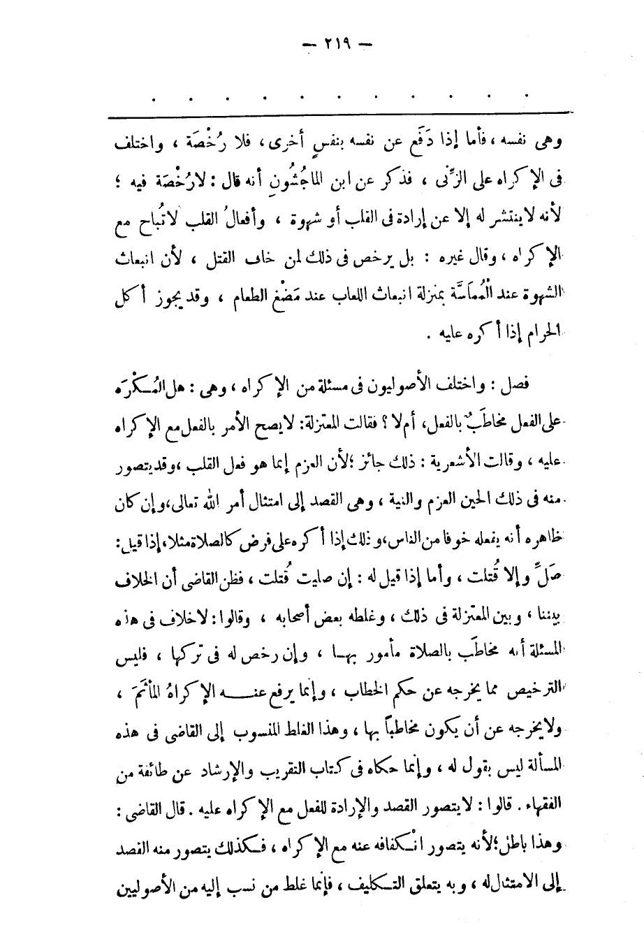 فَصْلٌ: واختلف الأصوليون فى مسئلة مِنْ الْإِكْرَاهِ، وَهِيَ: هَلْ الْمُكْرَهُ عَلَى الْفِعْلِ مُخَاطَبٌ بِالْفِعْلِ، أَمْ لَا؟ فَقَالَتْ الْمُعْتَزِلَةُ: لَا يَصِحّ الْأَمْرُ بِالْفِعْلِ مَعَ الْإِكْرَاهِ عَلَيْهِ، وَقَالَتْ الْأَشْعَرِيّةُ: ذَلِكَ جَائِزٌ؛ لِأَنّ الْعَزْمَ إنّمَا هُوَ فِعْلُ الْقَلْبِ، وَقَدْ يُتَصَوّرُ مِنْهُ فِي ذَلِكَ الْحِينِ الْعَزْمُ وَالنّيّةُ، وَهِيَ الْقَصْدُ إلَى امْتِثَالِ أَمْرِ اللهِ تَعَالَى، وَإِنْ كَانَ ظَاهِرُهُ أَنّهُ يَفْعَلُهُ خَوْفًا مِنْ النّاسِ، وَذَلِكَ إذَا أُكْرِهَ عَلَى فَرْضٍ كَالصّلَاةِ مَثَلًا، إذَا قِيلَ: