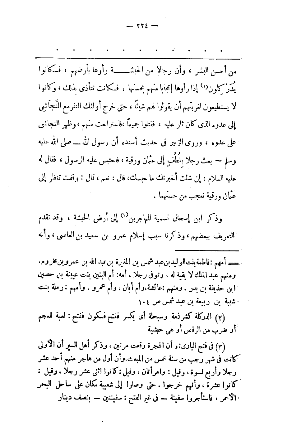 (2) فى فتح البارى: «أن الهجرة وقعت مرتين، وذكر أهل السير أن الأولى كانت فى شهر رجب من سنة خمس من المبعث، وأن أول من هاجر منهم أحد عشر رجلا وأربع نسوة، وقيل: وامرأتان، وقيل: كانوا اثنى عشر رجلا، وقيل: كانوا عشرة، وأنهم خرجوا. حتى وصلوا إلى شعيبة مكان على ساحل البحر الأحمر، فاستأجروا سفينة- فى غير الفتح: سفينتين- بنصف دينار