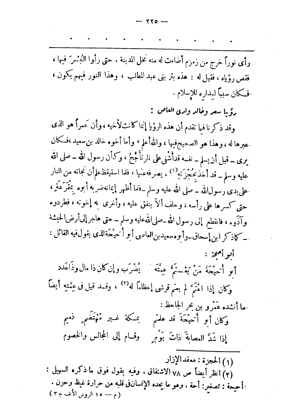 وَقَدْ ذَكَرْنَا فِيمَا تَقَدّمَ أَنّ هَذِهِ الرّؤْيَا إنّمَا كَانَتْ لِأَخِيهِ، وَأَنّ عَمْرًا هُوَ الّذِي عَبّرَهَا لَهُ، وَهَذَا هُوَ الصّحِيحُ فِيهَا، وَاَللهُ أَعْلَمُ، وَأَمّا أَخُوهُ خَالِدُ بْنُ سَعِيدٍ، فَكَانَ يَرَى- قَبْلَ أَنْ يُسْلِمَ- نَفْسَهُ قَدْ أشفى على نار تأجّح، وكان رسول الله- صلى الله عليه وسلم- قَدْ أَخَذَ بِحُجْزَتِهِ «1» ، يَصْرِفُهُ عَنْهَا، فَلَمّا اسْتَيْقَظَ عَلِمَ أَنّ نَجَاتَهُ مِنْ النّارِ عَلَى يَدَيْ رَسُولِ اللهِ- صَلّى اللهُ عَلَيْهِ وَسَلّمَ- فلما أَظْهَرَ إيمَانَهُ ضَرَبَهُ أَبُوهُ بِمَقْرَعَةِ، حَتّى كَسَرَهَا عَلَى رَأْسِهِ، وَحَلَفَ أَلّا يُنْفِقَ عَلَيْهِ، وَأَغْرَى بِهِ إخْوَتَهُ، فَطَرَدُوهُ وَآذَوْهُ، فَانْقَطَعَ إلَى رَسُولِ اللهِ- صَلَّى اللَّهُ عَلَيْهِ وَسَلَّمَ- حَتّى هَاجَرَ إلَى أَرْضِ الْحَبَشَةِ- كَمَا ذَكَرَ ابْنُ إسْحَاقَ- وأبوه سعيد بن العاصى أَبُو أُحَيْحَةَ الّذِي يَقُولُ فِيهِ الْقَائِلُ: