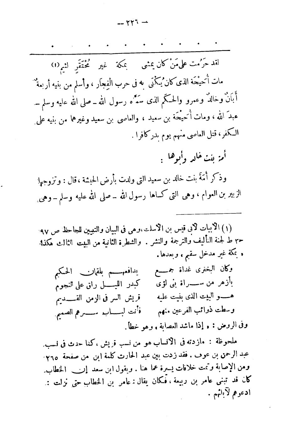 وفى الروض: «إذا ما شد العصابة» وهو خطأ. ملحوظة: مازدته فى الأنساب هو من نسب قريش، كما حدث فى نسب عبد الرحمن بن عوف. فقد زدت بين عبد الحارث كلمة ابن من صفحة 265 ومن الإصابة وتمت خلافات يسيرة عما هنا. ويقول ابن سعد إن الخطاب كان قد تبنى عامر بن ربيعة، فكان يقال: عامر بن الخطاب حتى نزلت: ادعوهم لابائهم.