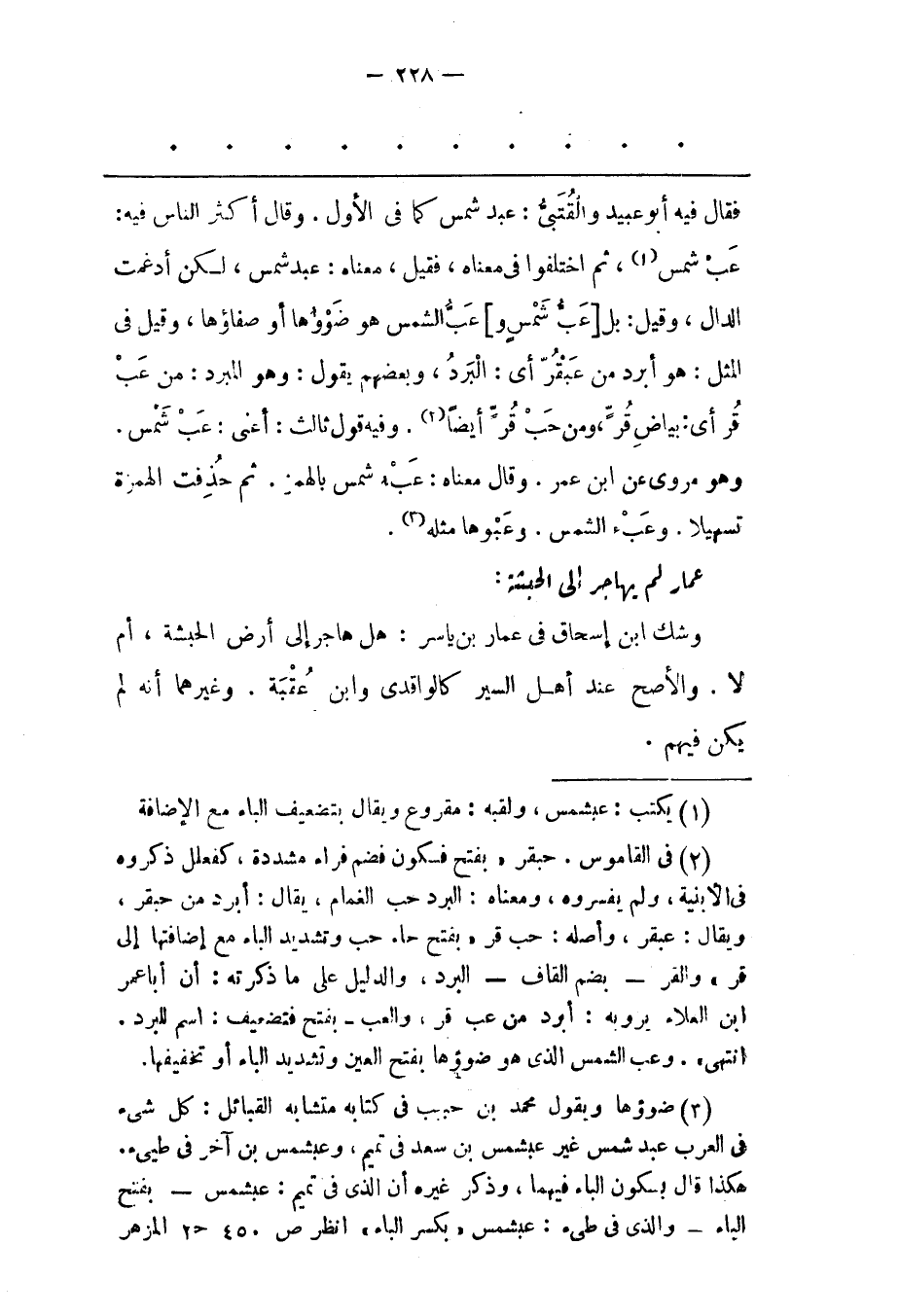 (3) ضوؤها ويقول محمد بن حبيب فى كتابه متشابه القبائل: كل شىء فى العرب عبد شمس غير عبشمس بن سعد فى تميم، وعبشمس بن آخر فى طيىء. هكذا قال بسكون الباء فيهما، وذكر غيره أن الذى فى تميم: عبشمس- بفتح الياء- والذى فى طىء: عبشمس «بكسر الباء» انظر ص 450 ح 2 المزهر