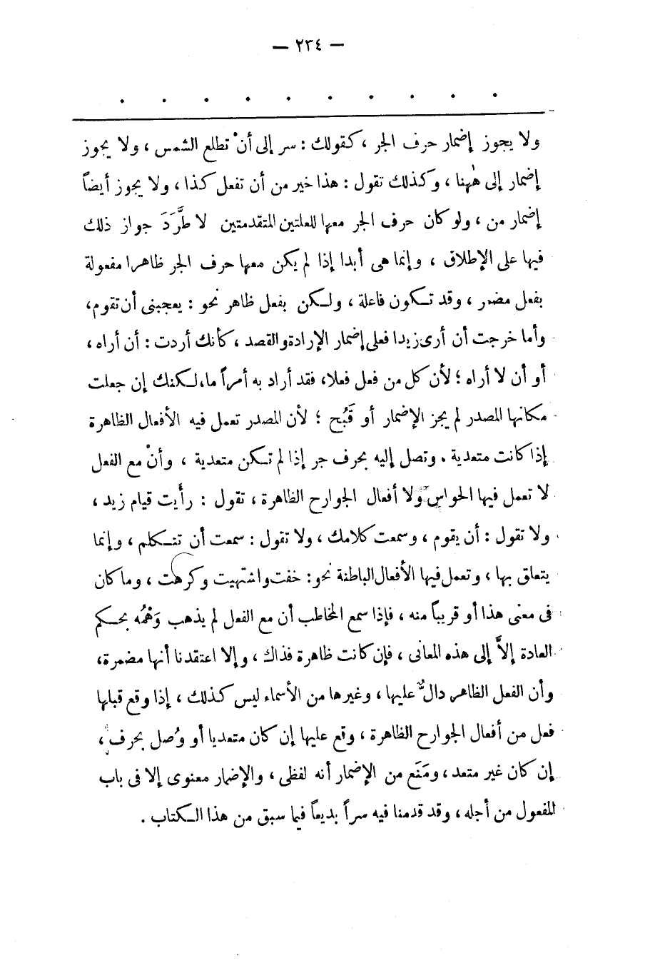 وَلَا يَجُوزُ إضْمَارُ حَرْفِ الْجَرّ، كَقَوْلِك: سِرْ إلَى أَنْ تَطْلُعَ الشّمْسُ، وَلَا يَجُوزُ إضْمَارٌ إلَى هَهُنَا، وَكَذَلِكَ تَقُولُ: هَذَا خَيْرٌ مِنْ أَنْ تَفْعَلَ كَذَا، وَلَا يَجُوزُ أَيْضًا إضْمَارُ مِنْ، وَلَوْ كَانَ حَرْفُ الْجَرّ مَعَهَا لِلْعِلّتَيْنِ المتقدمتين لا طرّد جَوَازُ ذَلِكَ فِيهَا عَلَى الْإِطْلَاقِ، وَإِنّمَا هِيَ أَبَدًا إذَا لَمْ يَكُنْ مَعَهَا حَرْفُ الْجَرّ ظَاهِرًا مَفْعُولَةً بِفِعْلِ مُضْمَرٍ، وَقَدْ تَكُونُ فَاعِلَةً، وَلَكِنْ بِفِعْلِ ظَاهِرٍ نَحْوُ: يُعْجِبنِي أَنْ تَقُومَ، وَأَمّا خَرَجْت أَنْ أَرَى زَيْدًا فَعَلَى إضْمَارِ الْإِرَادَةِ وَالْقَصْدِ، كَأَنّك أَرَدْت: أَنْ أَرَاهُ، أَوْ أَنْ لَا أَرَاهُ؛ لِأَنّ كُلّ مَنْ فَعَلَ فِعْلًا، فَقَدْ أَرَادَ بِهِ أَمْرًا مَا، لَكِنّك إنْ جَعَلْت مَكَانَهَا الْمَصْدَرَ لَمْ يَجُزْ الْإِضْمَارُ أَوْ قُبّحَ؛ لِأَنّ الْمَصْدَرَ تَعْمَلُ فِيهِ الْأَفْعَالُ الظّاهِرَةُ إذَا كَانَتْ مُتَعَدّيَةً، وَتَصِلُ إلَيْهِ بِحَرْفِ جَرّ إذَا لَمْ تَكُنْ مُتَعَدّيَةً، وَأَنّ مَعَ الْفِعْلِ لَا تَعْمَلُ فِيهَا الْحَوَاسّ وَلَا أَفْعَالُ الْجَوَارِحِ الظّاهِرَةِ، تَقُولُ: رَأَيْت قِيَامَ زَيْدٍ، وَلَا تَقُولُ: أَنْ يَقُومَ، وَسَمِعْت كَلَامَك، وَلَا تَقُولُ: سَمِعْت أَنْ تَتَكَلّمَ، وَإِنّمَا يَتَعَلّقُ بِهَا، وَتَعْمَلُ فِيهَا الْأَفْعَالُ الْبَاطِنَةُ نَحْوُ: خِفْت وَاشْتَهَيْت وَكَرِهْت، وَمَا كَانَ فِي مَعْنَى هَذَا أَوْ قَرِيبًا مِنْهُ، فَإِذَا سَمِعَ الْمُخَاطَبُ أَنّ مَعَ الْفِعْلِ لَمْ يَذْهَبْ وَهْمُهُ بِحُكْمِ الْعَادَةِ إلّا إلَى هَذِهِ الْمَعَانِي، فَإِنْ كَانَتْ ظَاهِرَةً فَذَاكَ، وَإِلّا اعْتَقَدْنَا أَنّهَا مُضْمَرَةً، وَأَنّ الْفِعْلَ الظّاهِرَ دَالّ عَلَيْهَا، وَغَيْرُهَا مِنْ الْأَسْمَاءِ لَيْسَ كَذَلِكَ، إذَا وَقَعَ قَبْلَهَا فِعْلٌ مِنْ أَفْعَالِ الْجَوَارِحِ الظّاهِرَةِ، وَقَعَ عَلَيْهَا إنْ كَانَ مُتَعَدّيًا أَوْ وُصِلَ بِحَرْفِ، إنْ كَانَ غَيْرَ مُتَعَدّ، وَمُنِعَ مِنْ الْإِضْمَارِ أَنّهُ لَفْظِيّ، وَالْإِضْمَارُ مَعْنَوِيّ إلّا فِي بَابِ الْمَفْعُولِ مِنْ أَجْلِهِ، وَقَدْ قَدّمْنَا فِيهِ سِرّا بَدِيعًا فِيمَا سَبَقَ مِنْ هَذَا الْكِتَابِ.