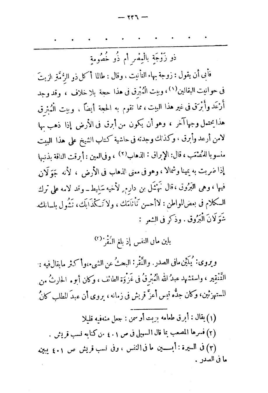 فَأَبَى أن يقول: زوجة بهاء التأنيت، وَقَالَ: طَالَمَا أَكَلَ ذُو الرّمّةِ الزّيْتَ فِي حَوَانِيتِ الْبَقّالِينَ «1» ، وَبَيْتُ الْمُبْرِقِ فِي هَذَا حُجّةٌ بِلَا خِلَافٍ، وَقَدْ وُجِدَ أُرْعِدُ وَأُبْرِقُ فِي غَيْرِ هَذَا الْبَيْتِ، مِمّا تَقُومُ بِهِ الْحُجّةُ أَيْضًا، وَبَيْتُ الْمُبْرِقِ هَذَا يَحْتَمِلُ وَجْهًا آخَرَ، وَهُوَ أَنْ يَكُونَ مِنْ أَبْرَقَ فِي الْأَرْضِ إذَا ذَهَبَ بِهَا لَا مِنْ أَرْعَدَ وَأَبْرَقَ، وَكَذَلِكَ وَجَدْته فِي حَاشِيَةِ كِتَابِ الشّيْخِ عَلَى هَذَا الْبَيْتِ مَنْسُوبًا لِلْمَصْعَبِ، قَالَ: الْإِبْرَاقُ: الذّهَابُ «2» ، وَفِي الْعَيْنِ: أَبَرَقَتْ النّاقَةُ بِذَنَبِهَا إذَا ضَرَبَتْ بِهِ يَمِينًا وَشِمَالًا، وَهُوَ فِي مَعْنَى الذّهَابِ فِي الْأَرْضِ، لِأَنّهُ جَوَلَانٌ فِيهَا، وَهِيَ الْبُرُوقُ، قَالَ نَهْشَلُ بْنُ دَارِمٍ لِأَخِيهِ سَلِيطٍ- وَقَدْ لَامَهُ عَلَى تَرْكِ الْكَلَامِ فِي بَعْضِ الْمَوَاطِنِ: لا أحسن تاثامك، وَلَا تَكْذَابَكَ، تَشُولُ بِلِسَانِك شَوَلَانَ الْبُرُوقِ. وَذَكَرَ فِي الشّعْرِ: