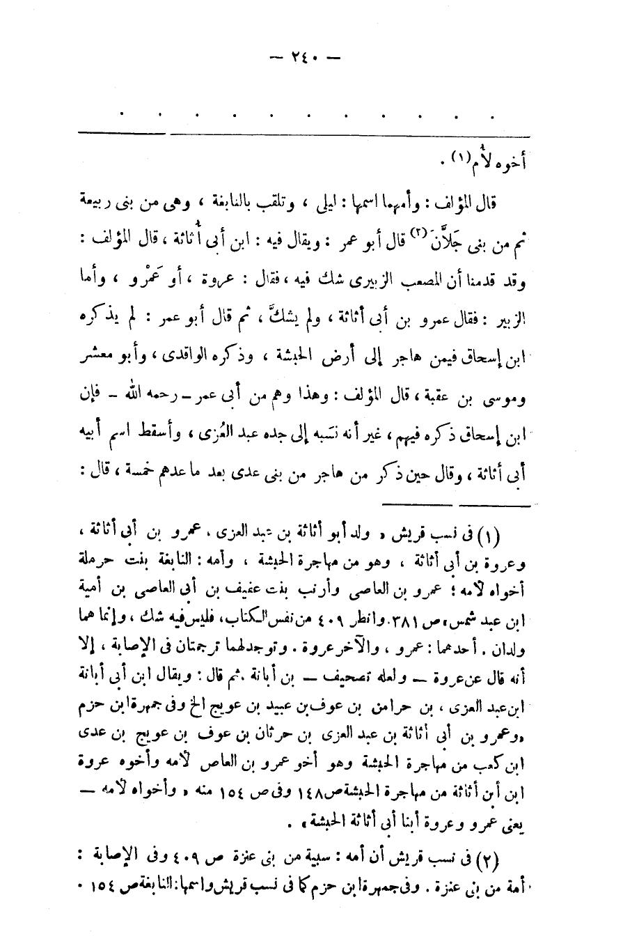 (1) فى نسب قريش «ولد أبو أثاثة بن عبد العزى، عمرو بن أبى أثاثة، وعروة بن أبى أثاثة، وهو من مهاجرة الحبشة، وأمه: النابغة بنت حرملة أخواه لأمه؛ عمرو بن العاصى وأرنب بنت عفيف بن أبى العاصى بن أمية ابن عبد شمس» ص 381. وانظر 409 من نفس الكتاب، فليس فيه شك، وإنما هما ولدان. أحدهما: عمرو، والاخر عروة. وتوجد لهما ترجمتان فى الإصابة، إلا أنه قال عن عروة- ولعله تصحيف- بن أبانة، ثم قال: ويقال ابن أبى أبانة ابن عبد العزى، بن حرامن بن عوف بن عبيد بن عويج الخ وفى جمهرة ابن حزم «وعمرو بن أبى أثاثة بْنُ عَبْدِ الْعُزّى بْنِ حُرْثَانَ بْنِ عَوْفِ بن عويج بن عدى ابن كعب من مهاجرة الحبشة وهو أخو عمرو بن العاص لأمه وأخوه عروة ابن أبن أثاثة من مهاجرة الحبشة ص 148 وفى ص 154 منه «وأخواه لأمه- يعنى عمرو وعروة أبنا أبى أثاثة الحبشة» .