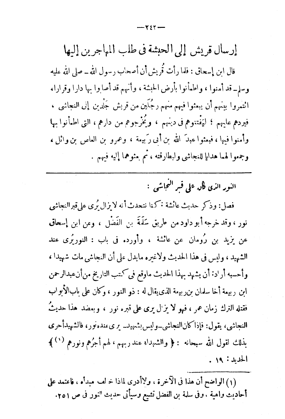 فَصْلٌ: وَذَكَرَ حَدِيثَ عَائِشَةَ: كُنّا نَتَحَدّثُ أَنّهُ لَا يَزَالُ يَرَى عَلَى قَبْرِ النّجَاشِيّ نُورٌ، وَقَدْ خَرّجَهُ أَبُو دَاوُدَ مِنْ طَرِيقِ سَلَمَةَ بْنِ الْفَضْلِ، وَعَنْ ابْنِ إسْحَاقَ عَنْ يَزِيدَ بْنِ رُومَانَ عَنْ عَائِشَةَ، وَأَوْرَدَهُ فِي بَابِ: النّورُ يُرَى عِنْدَ الشّهِيدِ، وَلَيْسَ فِي هَذَا الْحَدِيثِ وَلَا غَيْرِهِ مَا يَدُلّ عَلَى أَنّ النّجَاشِيّ مَاتَ شَهِيدًا، وَأَحْسَبُهُ أَرَادَ: أَنْ يَشْهَدَ بِهَذَا الْحَدِيثِ مَا وَقَعَ فِي كُتُبِ التّارِيخِ مِنْ أن عبد الرحمن ابن رَبِيعَةَ أَخَا سَلْمَانَ بْنِ رَبِيعَةَ الّذِي يُقَالُ لَهُ: ذُو النّورِ، وَكَانَ عَلَى بَابِ الْأَبْوَابِ فَقَتَلَهُ التّرْكُ زَمَانَ عُمَرَ، فَهُوَ لَا يَزَالُ يُرَى عَلَى قَبْرِهِ نُورٌ، وَبِعَضُدِ هَذَا حَدِيثُ النّجَاشِيّ، يَقُولُ: فَإِذَا كَانَ النّجَاشِيّ- وَلَيْسَ بِشَهِيدِ- يُرَى عِنْدَهُ نُورٌ، فَالشّهِيدُ أَحْرَى بِذَلِكَ لِقَوْلِ اللهِ سُبْحَانَهُ: وَالشُّهَداءُ عِنْدَ رَبِّهِمْ، لَهُمْ أَجْرُهُمْ وَنُورُهُمْ «1» الحديد: 19.