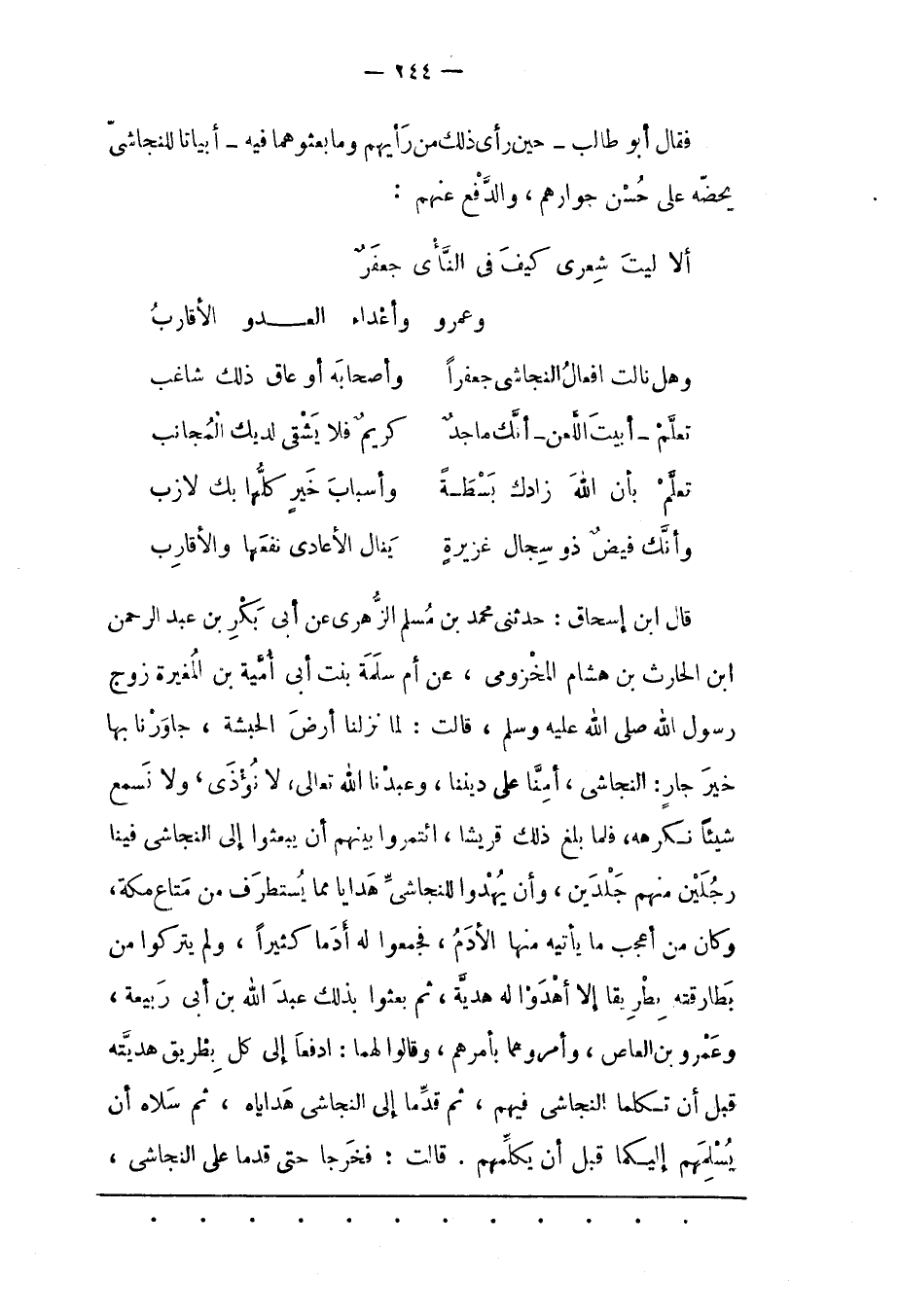 قال ابن إسحاق: حدثني محمد بن مسلم الزّهْرِيّ عَنْ أَبِي بَكْرِ بْنِ عَبْدِ الرّحْمَنِ ابن الْحَارِثِ بْنِ هِشَامٍ الْمَخْزُومِيّ، عَنْ أُمّ سَلَمَةَ بِنْتِ أَبِي أُمَيّةَ بْنِ الْمُغِيرَةِ زَوْجِ رَسُولِ اللهِ صَلّى اللهُ عَلَيْهِ وَسَلّمَ، قَالَتْ: لَمّا نَزَلْنَا أَرْضَ الْحَبَشَةِ، جَاوَرْنَا بِهَا خَيْرَ جَارٍ: النّجَاشِيّ، أَمِنّا عَلَى دِينِنَا، وَعَبَدْنَا اللهَ تَعَالَى، لَا نُؤْذَى، وَلَا نَسْمَعُ شَيْئًا نَكْرَهُهُ، فَلَمّا بَلَغَ ذَلِكَ قُرَيْشًا، ائْتَمَرُوا بَيْنَهُمْ أَنْ يَبْعَثُوا إلَى النّجَاشِيّ فِينَا رَجُلَيْنِ مِنْهُمْ جَلْدَيْنِ، وَأَنْ يُهْدُوا لِلنّجَاشِيّ هَدَايَا مِمّا يُسْتَطْرَفُ مِنْ مَتَاعِ مَكّةَ، وَكَانَ مِنْ أَعْجَبِ مَا يَأْتِيهِ مِنْهَا الْأُدْمُ، فَجَمَعُوا لَهُ أُدْمًا كَثِيرًا، وَلَمْ يَتْرُكُوا مِنْ بَطَارِقَتِهِ بِطْرِيقًا إلّا أَهْدَوْا لَهُ هَدِيّةً، ثُمّ بَعَثُوا بِذَلِكَ عَبْدَ اللهِ بْنَ أَبِي رَبِيعَةَ، وَعَمْرَو بْنَ الْعَاصِ، وَأَمَرُوهُمَا بِأَمْرِهِمْ، وَقَالُوا لَهُمَا: ادْفَعَا إلَى كُلّ بِطْرِيقٍ هَدِيّتَهُ قَبْلَ أَنْ تُكَلّمَا النّجَاشِيّ فِيهِمْ، ثُمّ قَدّمَا إلَى النّجَاشِيّ هَدَايَاهُ، ثُمّ سَلَاهُ أَنْ يُسَلّمَهُمْ إلَيْكُمَا قَبْل أَنْ يُكَلّمَهُمْ. قَالَتْ: فَخَرَجَا حَتّى قَدِمَا على النجاشى،