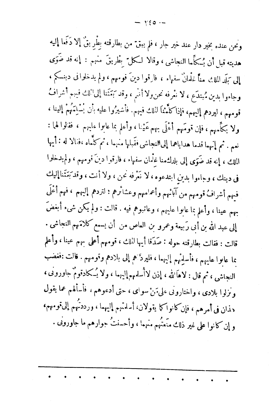 وَنَحْنُ عِنْدَهُ بِخَيْرِ دَارٍ عِنْدَ خَيْرِ جَارٍ، فَلَمْ يَبْقَ مِنْ بِطَارِقَتِهِ بِطْرِيقٌ إلّا دَفَعَا إلَيْهِ هَدِيّتَهُ قَبْل أَنْ يُكَلّمَا النّجَاشِيّ، وَقَالَا لِكُلّ بِطْرِيقٍ مِنْهُمْ: إنّهُ قَدْ ضَوَى إلَى بلد الملك مِنّا غِلْمَانٌ سُفَهَاءُ، فَارَقُوا دِينَ قَوْمِهِمْ، وَلَمْ يدخلوا فى دينكم، وجاؤا بِدِينِ مُبْتَدَعٍ، لَا نَعْرِفُهُ نَحْنُ وَلَا أَنْتُمْ، وَقَدْ بَعَثَنَا إلَى الْمَلِكِ فِيهِمْ أَشْرَافَ قَوْمِهِمْ، لِيَرُدّهُمْ إلَيْهِمْ، فَإِذَا كَلّمْنَا الْمَلِكَ فِيهِمْ، فَأَشِيرُوا عَلَيْهِ بِأَنْ يُسَلّمَهُمْ إلَيْنَا، وَلَا يُكَلّمَهُمْ، فَإِنّ قومهم أعلى بهم عينا، وأعلم بما عابوا عَلَيْهِمْ، فَقَالُوا لَهُمَا: