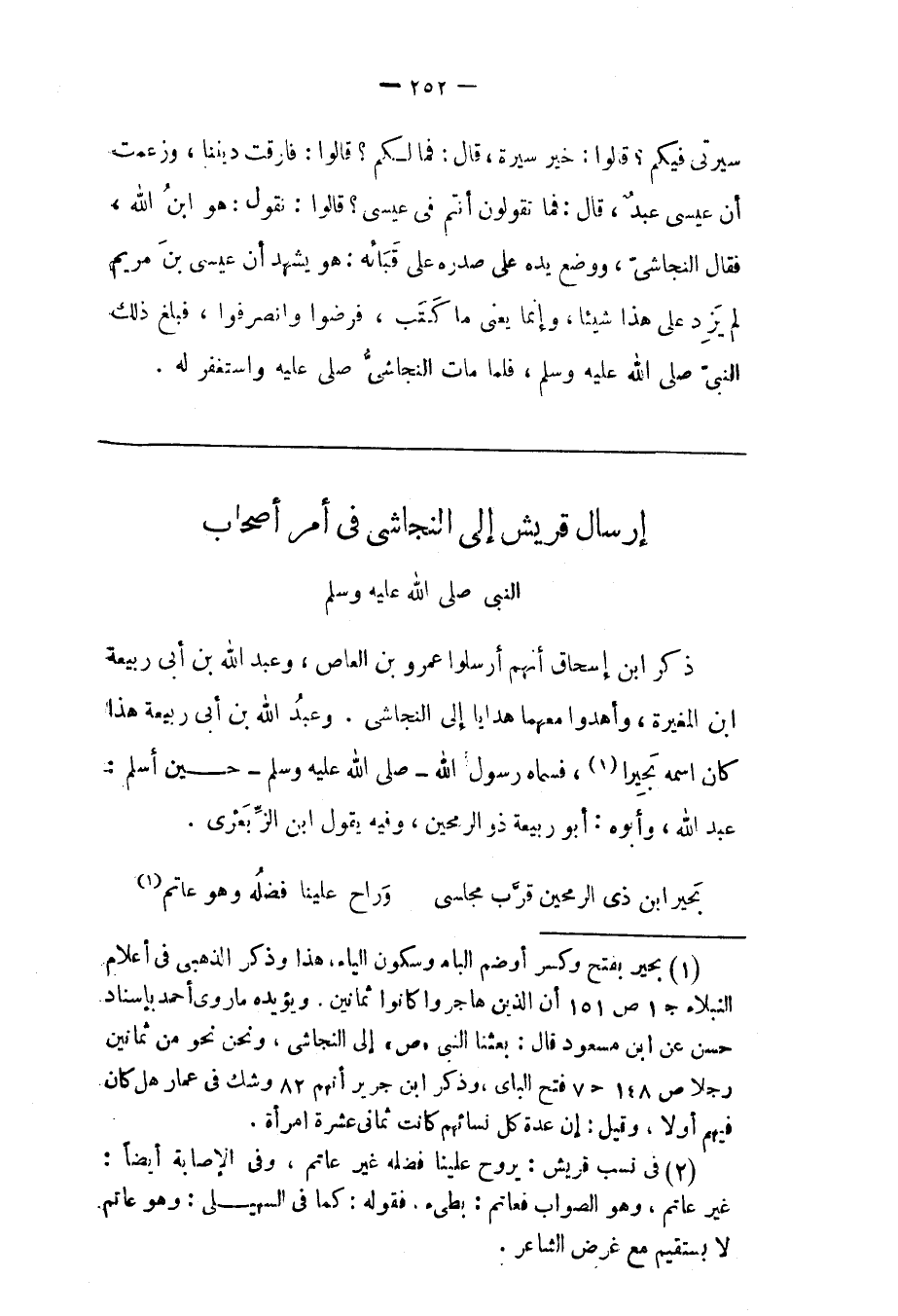 (1) بحير بفتح وكسر أو ضم الباء وسكون الياء، هذا وذكر الذهبى فى أعلام النبلاء ج 1 ص 151 أن الذين هاجروا كانوا ثمانين. ويؤيده ما روى أحمد بإسناد حسن عن ابن مسعود قال: بعثنا النبى «ص» إلى النجاشى، ونحن نحو من ثمانين رجلا ص 148 ح 7 فتح الباى، وذكر ابن جرير أنهم 82 وشك فى عمار هل كان فيهم أولا، وقيل: إن عدة كل نسائهم كانت ثمانى عشرة امرأة.