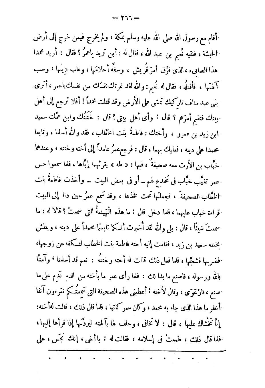 أَقَامَ مَعَ رَسُولِ اللهِ صَلَّى اللَّهُ عَلَيْهِ وَسَلَّمَ بِمَكّةَ، وَلَمْ يَخْرَجْ فِيمَنْ خَرَجَ إلَى أَرْضِ الْحَبَشَةِ، فَلَقِيَهُ نُعَيْمُ بْنُ عَبْدِ اللهِ، فَقَالَ لَهُ: أَيْنَ تُرِيدُ يَا عُمَرُ؟ فَقَالَ: أريد محمدا هذا الصابىء، الّذِي فَرّقَ أَمْرَ قُرَيْشٍ، وَسَفّهُ أَحْلَامَهَا، وَعَابَ دِينَهَا، وَسَبّ آلِهَتَهَا، فَأَقْتُلَهُ، فَقَالَ لَهُ نُعَيْمٌ: وَاَللهِ لَقَدْ غَرّتْك نَفْسُك مِنْ نَفْسِك يَا عُمَرُ، أَتَرَى بَنِي عَبْدِ مَنَافٍ تَارِكِيك تَمْشِي عَلَى الْأَرْضِ وَقَدْ قَتَلْت مُحَمّدًا! أَفَلَا تَرْجِعُ إلَى أَهْلِ بَيْتِك فَتُقِيمَ أَمْرَهُمْ؟ قَالَ: وَأَيّ أَهْلِ بَيْتِي؟ قَالَ: خَتَنُك وَابْنُ عَمّك سَعِيدُ ابن زَيْدِ بْنِ عَمْرٍو، وَأُخْتُك: فَاطِمَةُ بِنْتُ الْخَطّابِ، فَقَدْ وَاَللهِ أَسْلَمَا، وَتَابَعَا مُحَمّدًا عَلَى دِينِهِ، فَعَلَيْك بِهِمَا، قَالَ: فَرَجَعَ عُمَرُ عَامِدًا إلَى أُخْتِهِ وَخَتَنِهِ، وَعِنْدَهُمَا خَبّابُ بْنُ الْأَرَتّ مَعَهُ صَحِيفَةٌ، فِيهَا: «طَه» يُقْرِئُهُمَا إيّاهَا، فَلَمّا سَمِعُوا حِسّ عُمَرَ تَغَيّبْ خَبّابٌ فِي مِخْدَعٍ لَهُمْ- أَوْ فِي بَعْضِ الْبَيْتِ- وَأَخَذَتْ فَاطِمَةُ بِنْتُ الْخَطّابِ الصّحِيفَةَ، فَجَعَلَتْهَا تَحْتَ فَخِذِهَا، وَقْدَ سَمِعَ عُمَرُ حِينَ دَنَا إلَى الْبَيْتِ قِرَاءَةَ خَبّابٍ عَلَيْهِمَا، فَلَمّا دَخَلَ قَالَ: مَا هَذِهِ الْهَيْنَمَةُ الّتِي سَمِعْتُ؟ قَالَا لَهُ: مَا سَمِعْتَ شَيْئًا، قَالَ: بَلَى وَاَللهِ لَقَدْ أُخْبِرْت أَنّكُمَا تَابَعْتُمَا مُحَمّدًا عَلَى دِينِهِ، وَبَطَشَ بِخَتَنِهِ سَعِيدِ بْنِ زَيْدٍ، فَقَامَتْ إلَيْهِ أُخْتُهُ فَاطِمَةُ بِنْتُ الْخَطّابِ لَتَكُفّهُ عَنْ زَوْجِهَا، فَضَرَبَهَا فَشَجّهَا، فَلَمّا فَعَلَ ذَلِكَ قَالَتْ لَهُ أُخْتُهُ وَخَتَنُهُ: نَعَمْ قَدْ أَسْلَمْنَا، وَآمَنّا بِاَللهِ وَرَسُولِهِ، فَاصْنَعْ مَا بَدَا لَك: فَلَمّا رَأَى عُمَرُ مَا بِأُخْتِهِ مِنْ الدّمِ نَدِمَ عَلَى مَا صَنَعَ، فَاِرْعَوى، وَقَالَ لأخته: أعطينى هذه الصحيفة التى سمعتكم تقرؤن آنِفًا أَنْظُرْ مَا هَذَا الّذِي جَاءَ بِهِ مُحَمّدٌ، وَكَانَ عُمَرُ كَاتِبًا، فَلَمّا قَالَ ذَلِكَ، قَالَتْ لَهُ أُخْتُهُ: