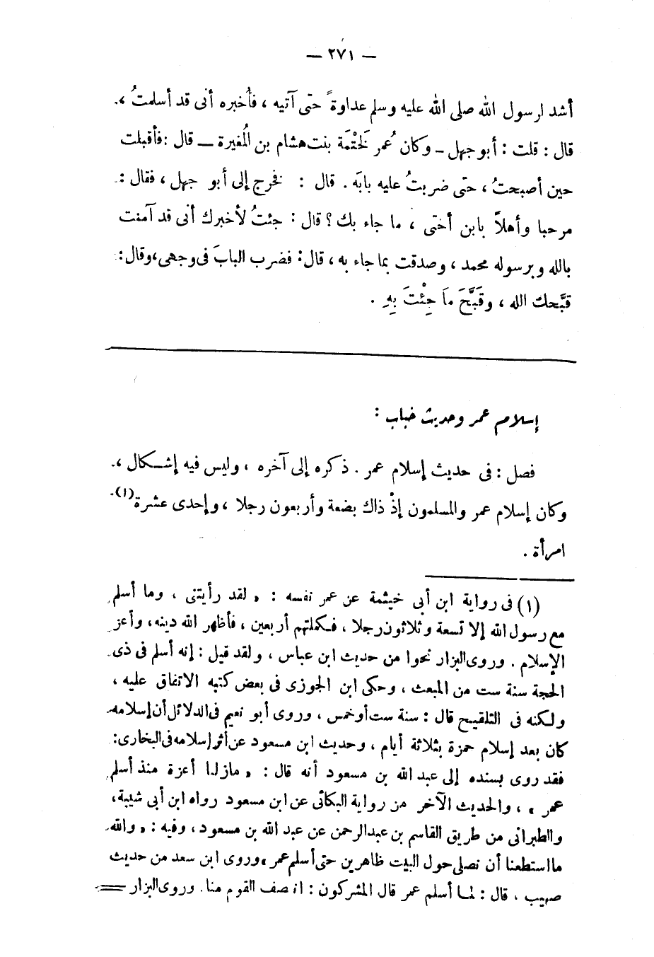 (1) فى رواية ابن أبى خيثمة عن عمر نفسه: «لقد رأيتنى، وما أسلم مع رسول الله إلا تسعة وثلاثون رجلا، فكملتهم أربعين، فأظهر الله دينه، وأعز الإسلام. وروى البزار نحوا من حديث ابن عباس، ولقد قيل: إنه أسلم فى ذى الحجة سنة ست من المبعث، وحكى ابن الجوزى فى بعض كتبه الاتفاق عليه، ولكنه فى التلقيح قال: سنة ست أو خمس، وروى أبو نعيم فى الدلائل أن إسلامه كان بعد إسلام حمزة بثلاثة أيام، وحديث ابن مسعود عن أثر إسلامه فى البخارى: فقد روى بسنده إلى عبد الله بن مسعود أنه قال: «مازلنا أعزة منذ أسلم عمر» ، والحديث الاخر من رواية البكائى عن ابن مسعود رواه ابن أبى شيبة، والطبرانى من طريق القاسم بن عبد الرحمن عن عبد الله بن مسعود، وفيه: «والله ما استطعنا أن نصلى حول البيت ظاهرين حتى أسلم عمر» وروى ابن سعد من حديث صهيب، قال: لما أسلم عمر قال المشركون: انصف القوم منا. وروى البزار-