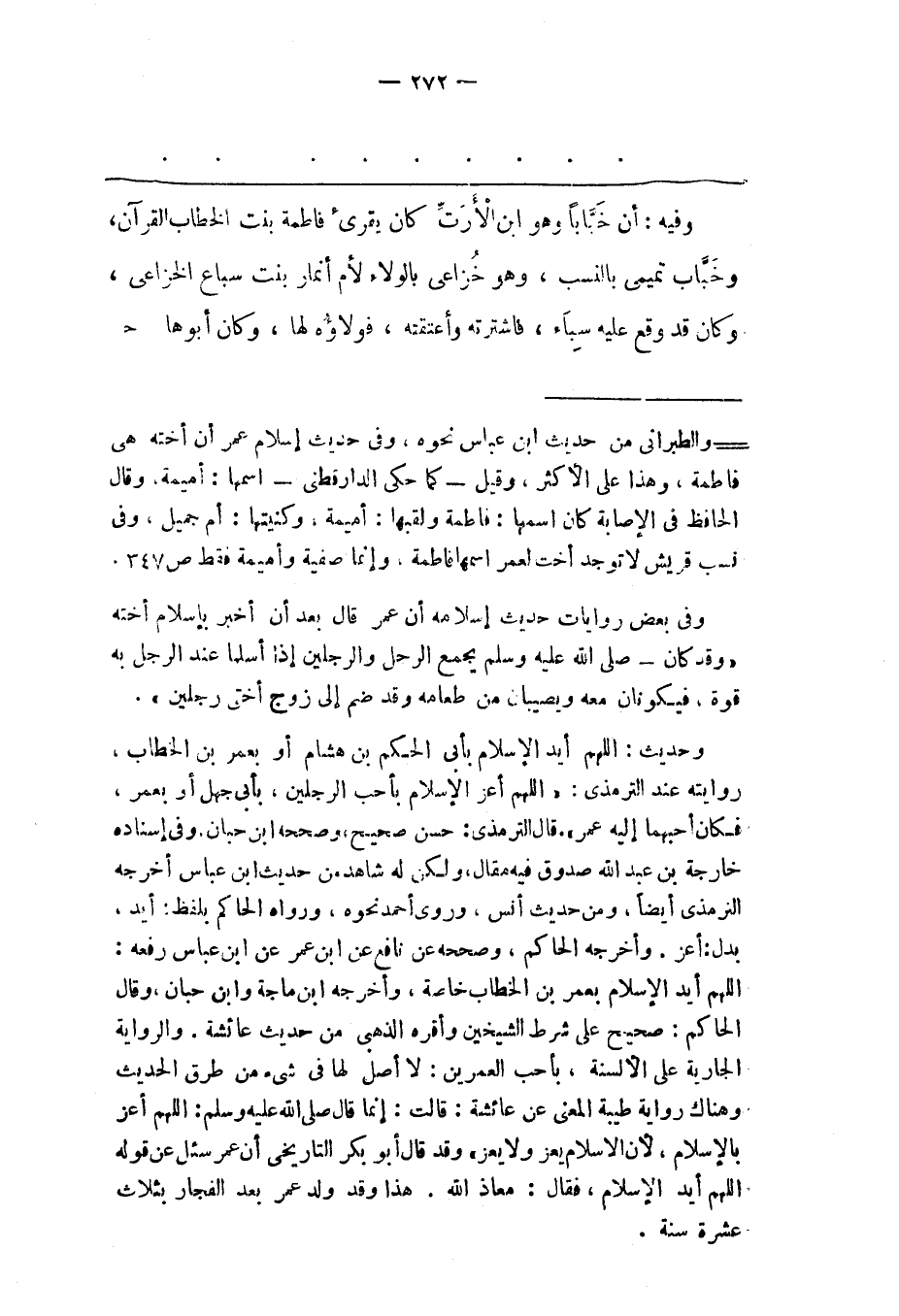 وَفِيهِ: أَنّ خَبّابًا وَهُوَ ابْنُ الْأَرَتّ كَانَ يُقْرِئُ فَاطِمَةَ بِنْتَ الْخَطّابِ الْقُرْآنَ، وَخَبّابٌ تَمِيمِيّ بِالنّسَبِ، وَهُوَ خُزَاعِي بِالْوَلَاءِ لِأُمّ أَنْمَارٍ بِنْتِ سِبَاعٍ الْخُزَاعِيّ، وَكَانَ قَدْ وَقَعَ عَلَيْهِ سِبَاءٌ، فاشترته وأعتقته، فولاؤه لها، وكان أبوها؟؟؟ ح