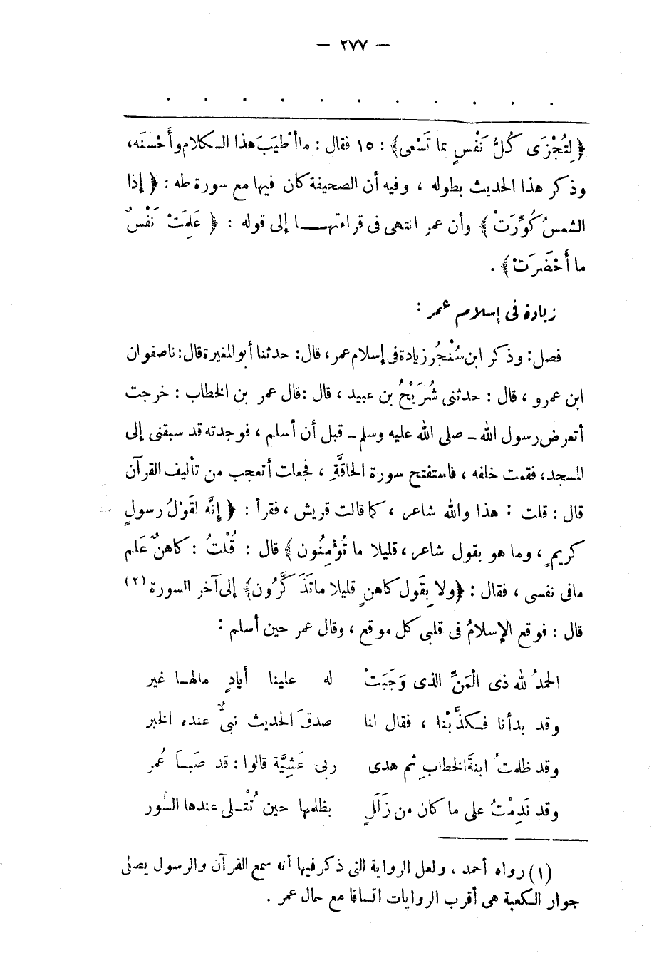 لِتُجْزى كُلُّ نَفْسٍ بِما تَسْعى: 15 فَقَالَ: مَا أَطْيَبَ هَذَا الْكَلَامَ وَأَحْسَنَهُ، وَذَكَرَ هَذَا الْحَدِيثَ بِطُولِهِ، وَفِيهِ أَنّ الصّحِيفَةَ كَانَ فيها مع سورة طه: إِذَا الشَّمْسُ كُوِّرَتْ وَأَنّ عُمَرَ انْتَهَى فِي قِرَاءَتِهَا إلَى قَوْلِهِ: عَلِمَتْ نَفْسٌ ما أَحْضَرَتْ.