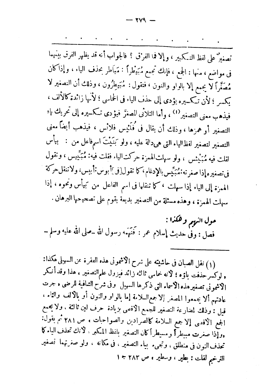 (1) نقل الصبان فى حاشيته على شرح الأشمونى هذه الفقرة عن السهيلى هكذا: «لو كسر حذفت ياؤه؛ لأنه خماسى ثالثه زائد فيزول علم التصغير، هذا وقد أنكر الأشمونى تصغير هذه الأسماء التى ذكرها السهيلى وفى شرح الشافية للرضى «جرت عادتهم ألا يجمعوا المصغر إلا جمع السلامة إما بالواو والنون أو بالألف والتاء، قيل: وذلك لمضارعة التصغير للجمع الأقصى بزيادة حرف لين ثالثة، ولا يجمع الجمع الأقصى إلا جمع السلامة كالصرادين والصواجبات» ص 281 ثم يقول: «وإذا صغرت مبيطرا ومسيطرا كان التصغير بلفظ المكبر، لأنك تحذف الياء كما تحذف النون فى منطلق، وتجىء بياء التصغير، فى مكانه، ولو صغرتهما تصغير الترخيم لقلت: بطير، وسطير» ص 283 ج 1