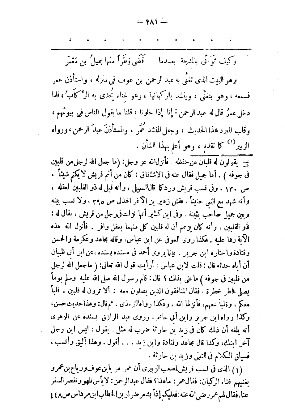 وَهُوَ الْبَيْتُ الّذِي تَغَنّى بِهِ عَبْدُ الرّحْمَنِ بْنُ عَوْفٍ فِي مَنْزِلِهِ، وَاسْتَأْذَنَ عُمَرَ فَسَمِعَهُ، وَهُوَ يَتَغَنّى، وَيُنْشِدُ بالركبانية، وَهُوَ غِنَاءٌ يُحْدَى بِهِ الرّكّابُ، فَلَمّا دَخَلَ عُمَرُ قَالَ لَهُ عَبْدُ الرّحْمَنِ: إنّا إذَا خَلَوْنَا، قُلْنَا مَا يَقُولُ النّاسُ فِي بُيُوتِهِمْ، وَقَلَبَ الْمُبَرّدُ هَذَا الْحَدِيثَ، وَجَعَلَ الْمُنْشِدُ عُمَرَ، وَالْمُسْتَأْذَنَ عَبْدَ الرّحْمَنِ، وَرَوَاهُ الزّبَيْرُ «1» كَمَا تَقَدّمَ، وَهُوَ أَعْلَمُ بِهَذَا الشّأْنِ.