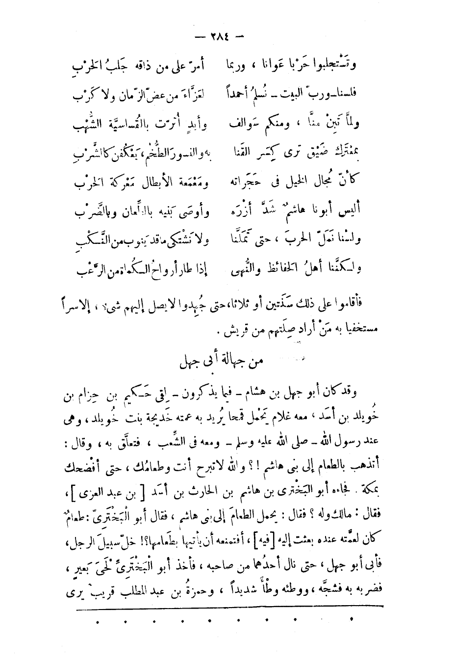 أَتَذْهَبُ بِالطّعَامِ إلَى بَنِي هَاشِمٍ!؟ وَاَللهِ لَا تَبْرَحُ أَنْت وَطَعَامُك، حَتّى أفضحك بمكة. فجاءه أَبُو الْبَخْتَرِيّ بْنُ هَاشِمِ بْنِ الْحَارِثِ بْنِ أسد [بن عبد العزى] ، فقال: مالك وَلَهُ؟ فَقَالَ: يَحْمِلُ الطّعَامَ إلَى بَنِي هَاشِمٍ، فقال أَبُو الْبَخْتَرِيّ: طَعَامٌ كَانَ لِعَمّتِهِ عِنْدَهُ بَعَثَتْ إلَيْهِ [فِيهِ] ، أَفَتَمْنَعُهُ أَنْ يَأْتِيَهَا بِطَعَامِهَا؟! خَلّ سَبِيلَ الرّجُلِ، فَأَبَى أَبُو جَهْلٍ، حَتّى نَالَ أحدهما من صاحبه، فأخذ أَبُو الْبَخْتَرِيّ لَحْيَ بَعِيرٍ، فَضَرَبَهُ بِهِ فَشَجّهُ، ووطئه وطأ شَدِيدًا، وَحَمْزَةُ بْنُ عَبْدِ الْمُطّلِبِ قَرِيبٌ يَرَى