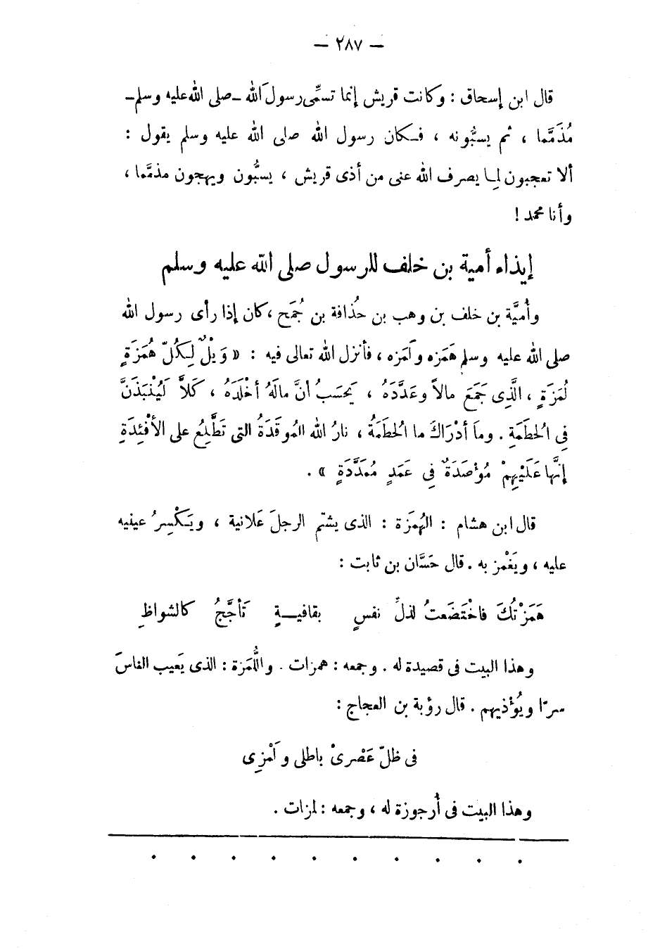 وَأُمَيّةُ بْنُ خَلَفِ بن وهب بن جذافة بْنِ جُمَحٍ، كَانَ إذَا رَأَى رَسُولُ اللهِ صَلَّى اللَّهُ عَلَيْهِ وَسَلَّمَ هَمَزَهُ وَلَمَزَهُ، فَأَنْزَلَ اللهُ تَعَالَى فِيهِ: «وَيْلٌ لِكُلِّ هُمَزَةٍ لُمَزَةٍ، الَّذِي جَمَعَ مَالًا وَعَدَّدَهُ، يَحْسَبُ أَنَّ مالَهُ أَخْلَدَهُ، كَلَّا لَيُنْبَذَنَّ فِي الْحُطَمَةِ. وَما أَدْراكَ مَا الْحُطَمَةُ، نارُ اللَّهِ الْمُوقَدَةُ الَّتِي تَطَّلِعُ عَلَى الْأَفْئِدَةِ إِنَّها عَلَيْهِمْ مُؤْصَدَةٌ فِي عَمَدٍ مُمَدَّدَةٍ» .
